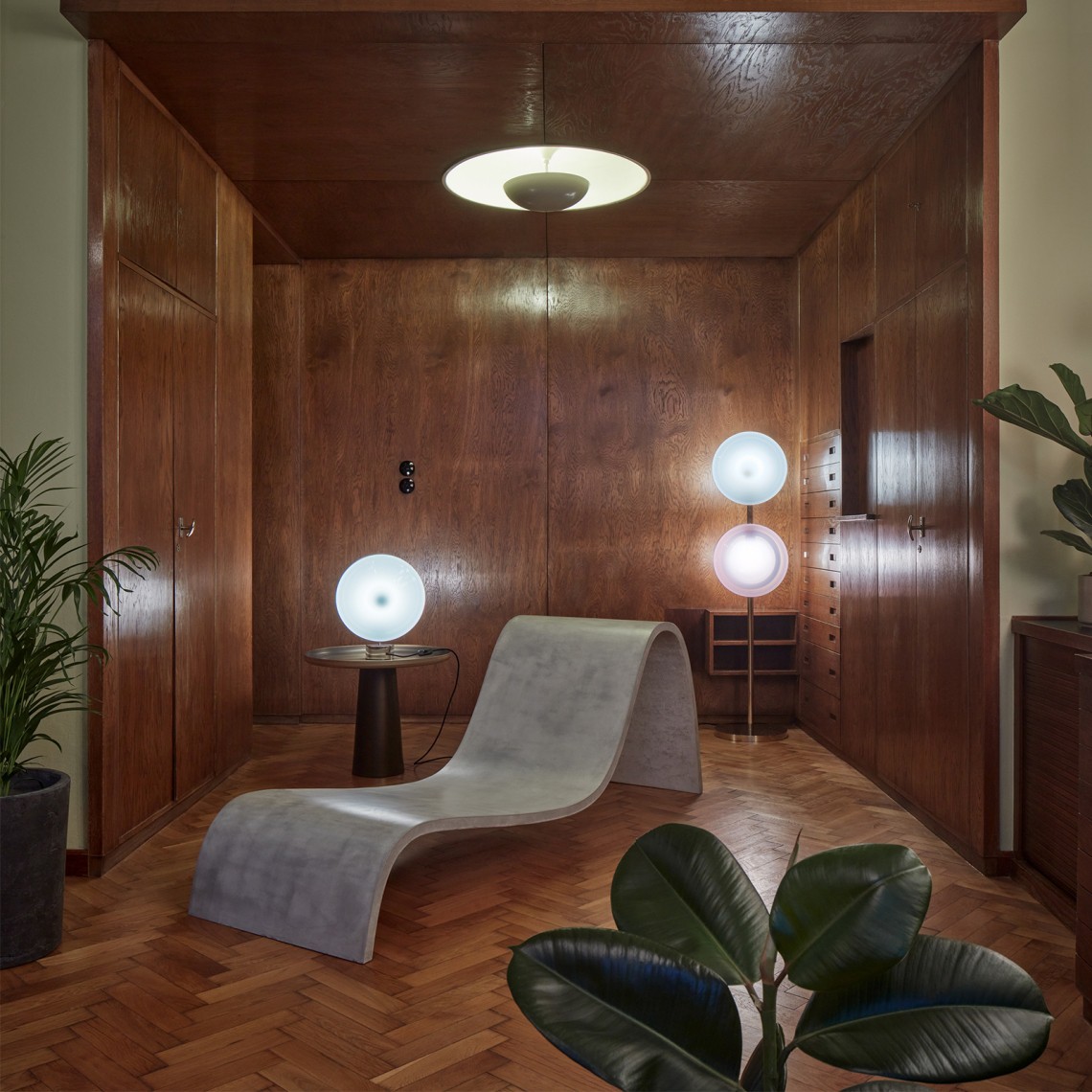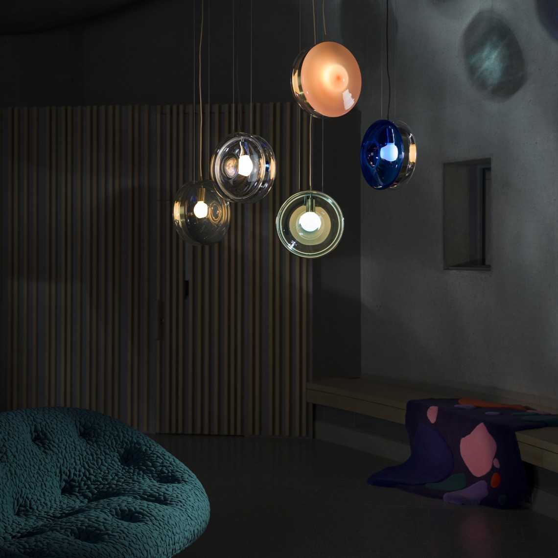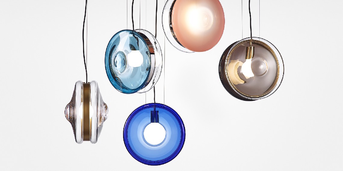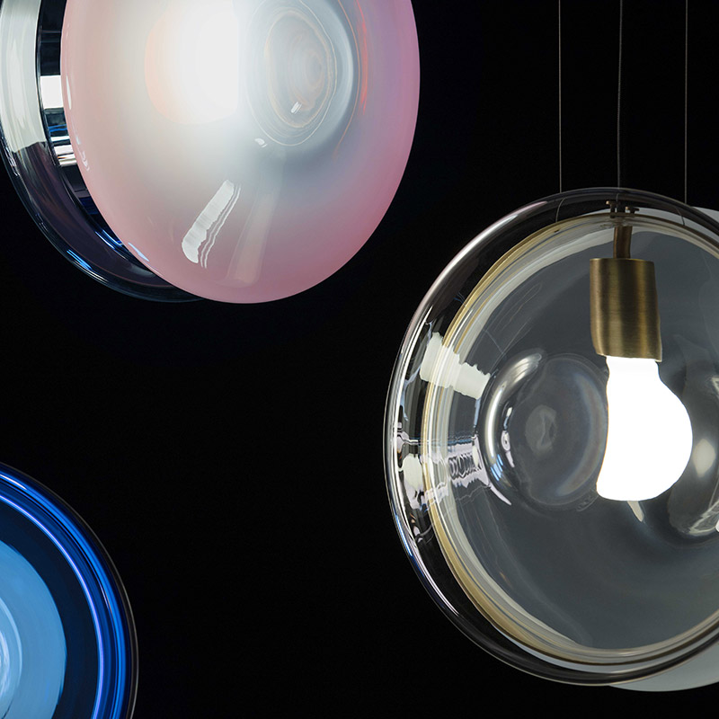 BOMMA’s Orbital traces paths of multicolored celestial bodies that glow with hypnotically red-hot cores. This ingenious design of mouth-blown glass lenses, held together by a metal mounting, creates a fascinating visual experience from many different angles. Our unique lighting objects in moonlight clear, pastel pink, sea blue, polar white and mysterious black, lend a truly magical atmosphere to any sophisticated interior.