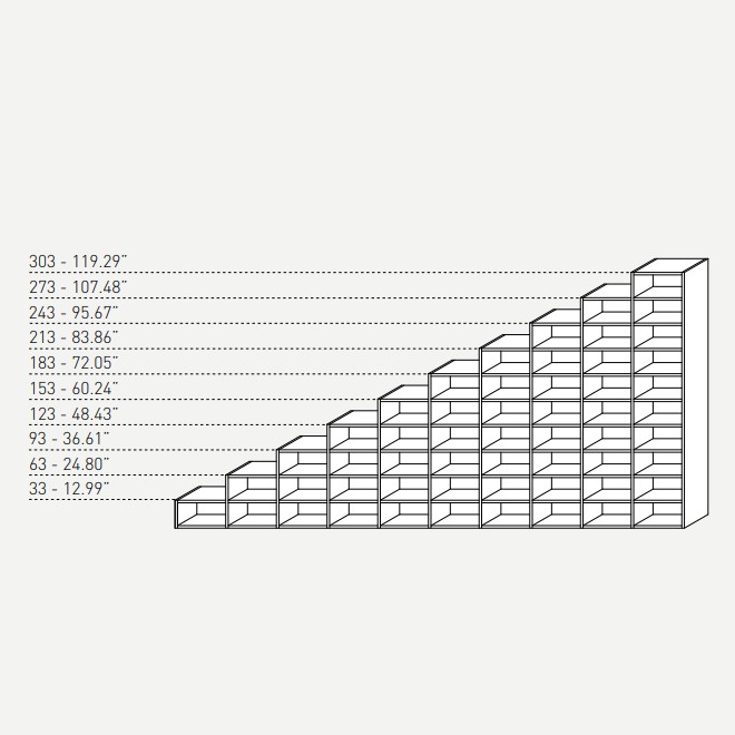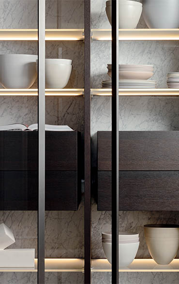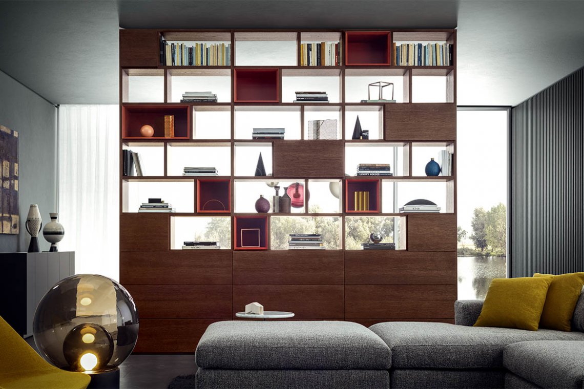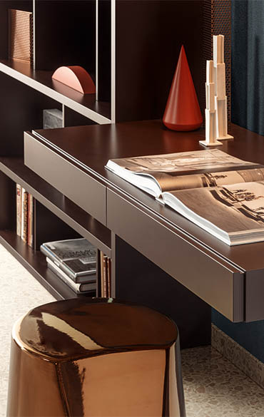Arranging a customised space for everything, creating distinctive combinations and balancing open and closed spaces: Spazioteca is the synergy of order, rhythm and proportion. The classic bookcase concept opens up to new versatile possibilities, providing a place to store objects, books and a TV screen, dividing areas of the home and integrating home office solutions. It is the first modular system with side panels, shelves, back panels and dividers with 1 cm pace as standard, and compartments with no visible holes or hardware. Every composition has the same dynamic, lightweight design, custom-made to meet every need.