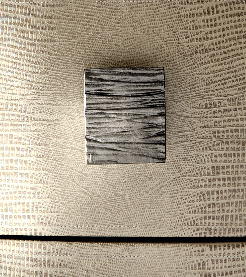 Double bookcase in armadillo printed leather with combination of bronzed brass top, base and handles. Back panel in high gloss polyester lacquer. 4 full extension drawers + 1 full extension file drawer with bottom in armadillo printed leather. Special led light sytem with 3 lights including touching switch.