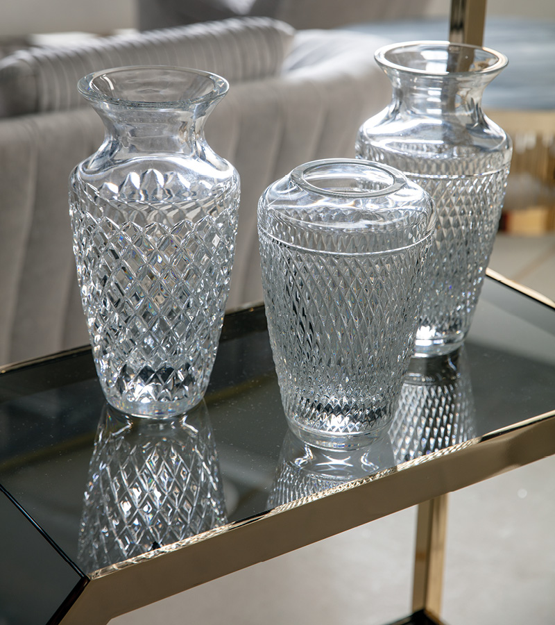 Bifacial showcase in light gold chrome stainless steel frame. 9 tempered fixed smoked glass shelves.