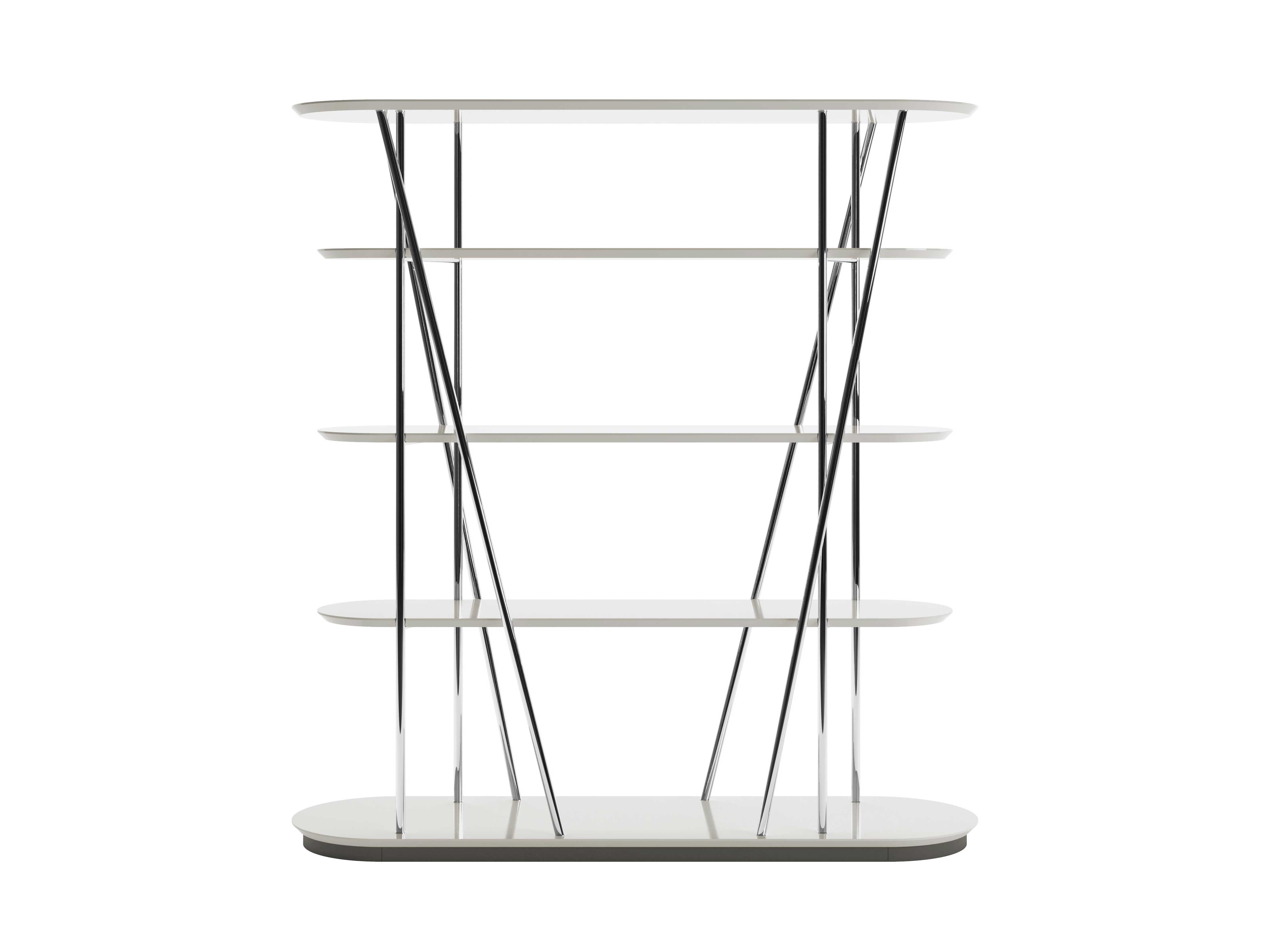The wooden shelves of Millepiedi bookshelf, matte or glossy lacquered in all the colour from the collection, are slightly tapered and characterised by round and blunt profiles which give the product a light and extremely sophisticated look.