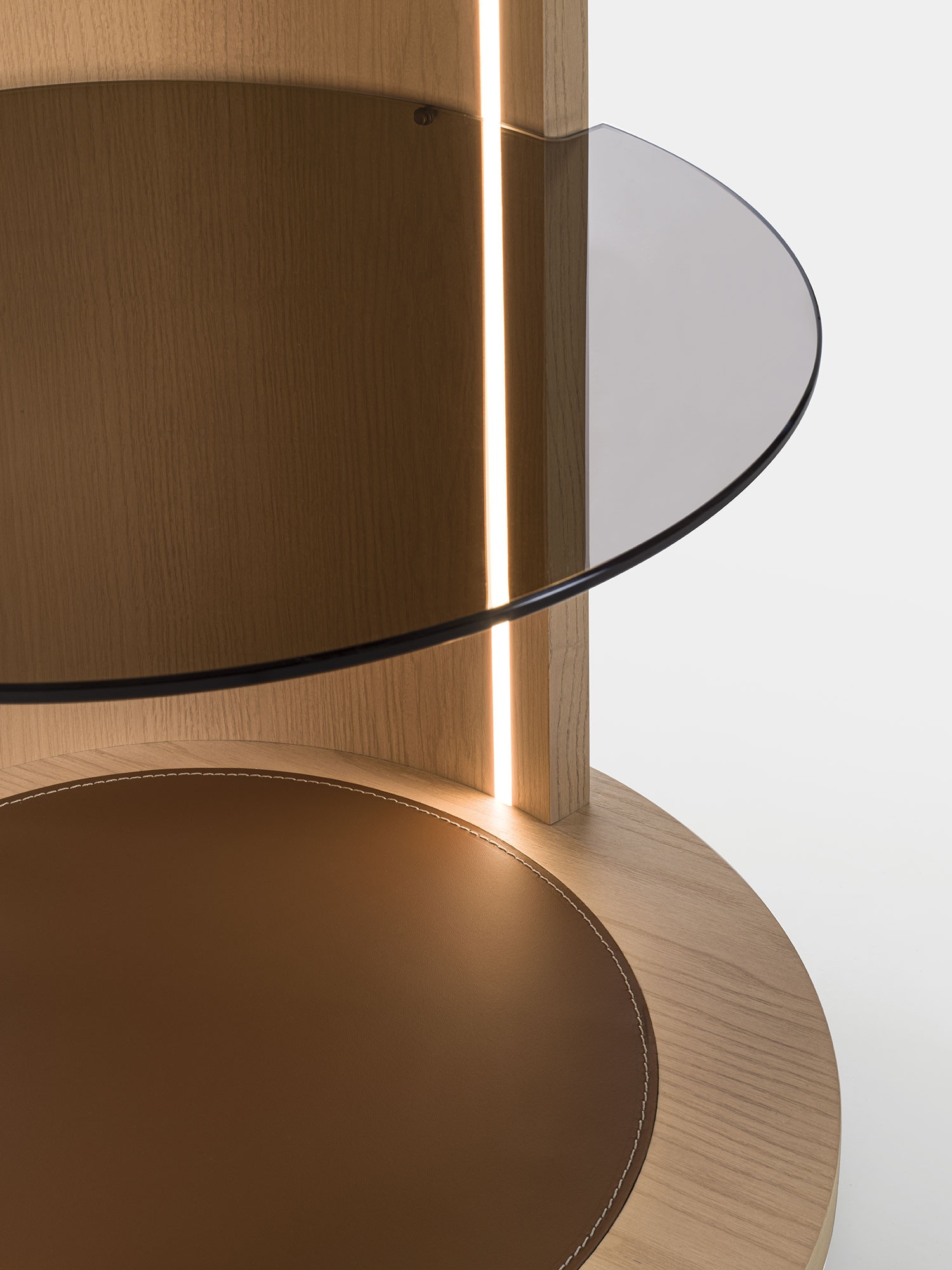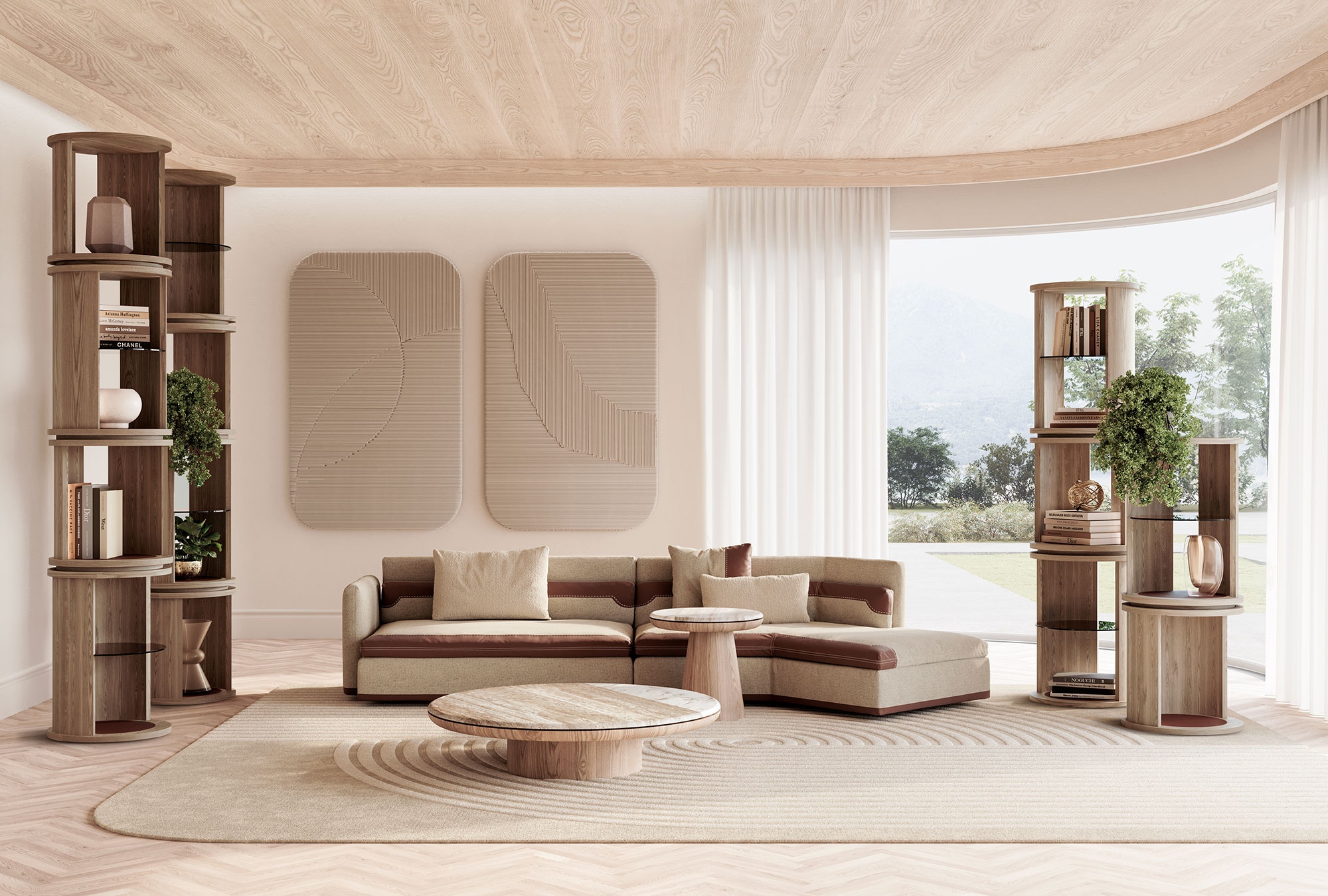 La libreria Roma entra a far parte della collezione Vittoria Frigerio grazie alla sua sofisticata microarchitettura basata sulla forma cilindrica che esalta le forme. Si caratterizza da una struttura in legno con inserti in cuoio. La struttura in legno, su cui possono poggiare dei ripiani in vetro, esalta una purezza formale che ricorda gli antichi totem rivisitati in versione moderna per un nuovo approccio decorativo per un elemento libreria. Bellezza immutata per un arredo senza tempo.