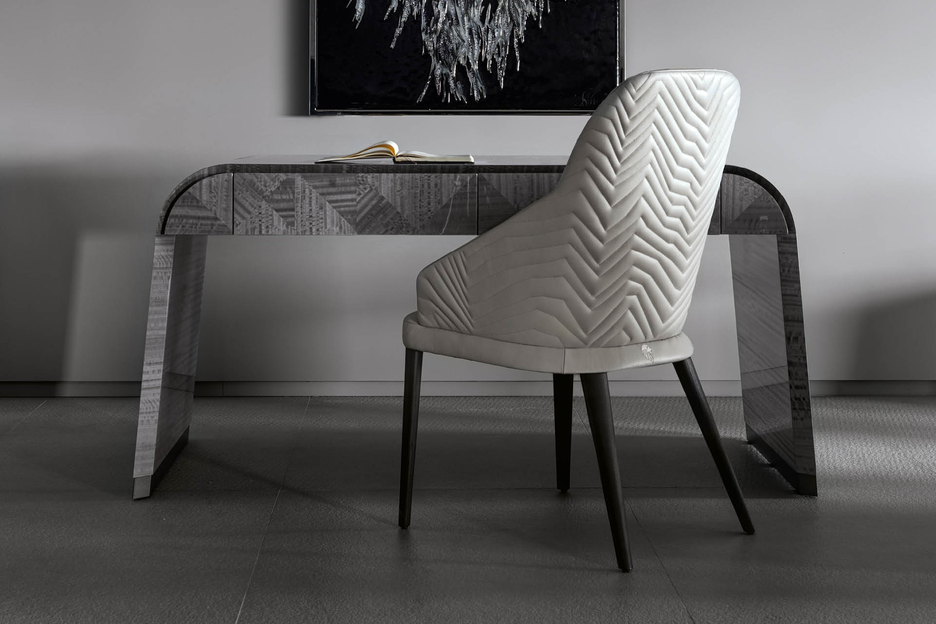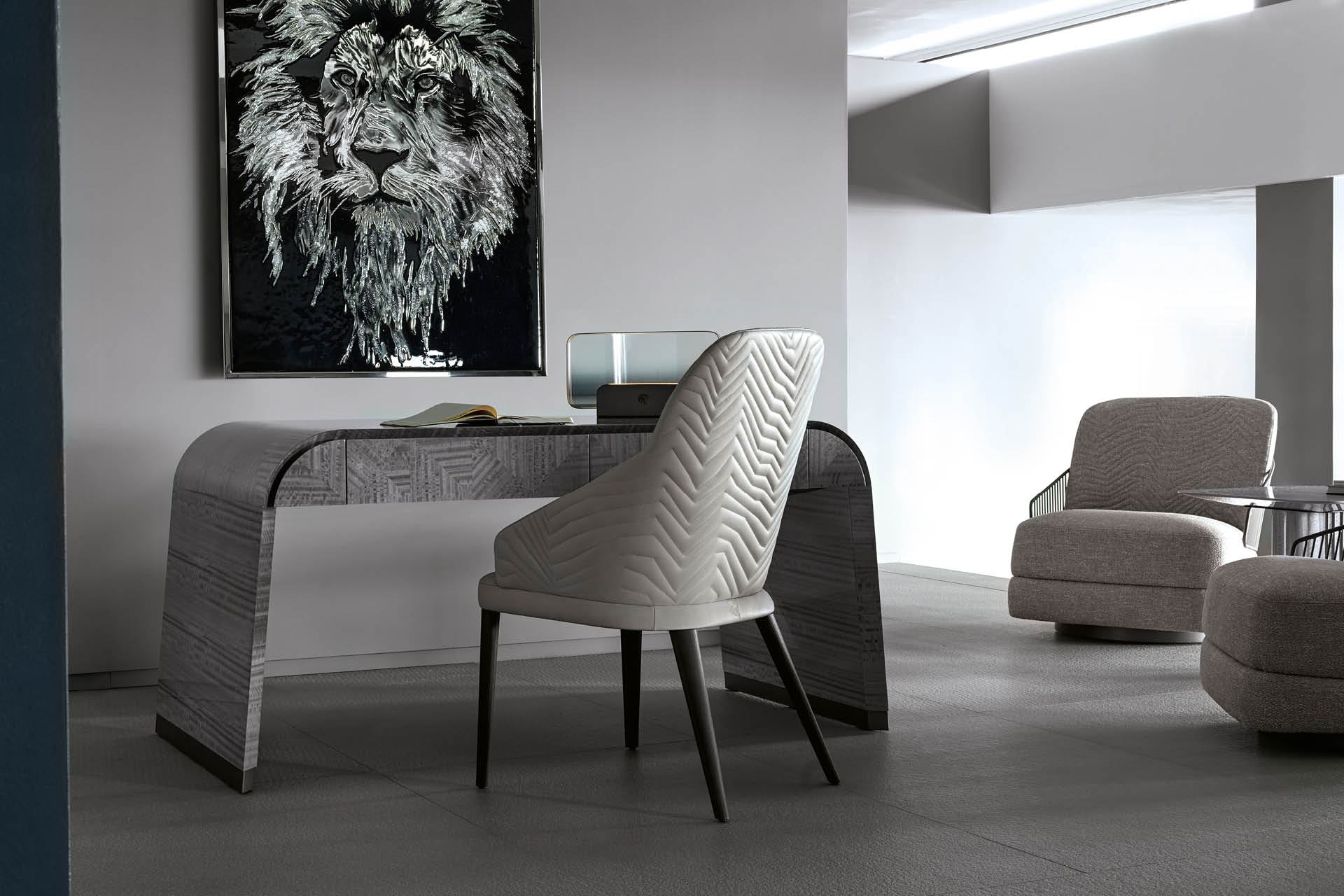 Curved home office desk in inlaid Tasmanian curly Eucaliptus veneer with high gloss polyester finish. Curved legs with details in satin grey nickel stainless steel. 2 external full extension drawers with bottom part in velvet fabric.