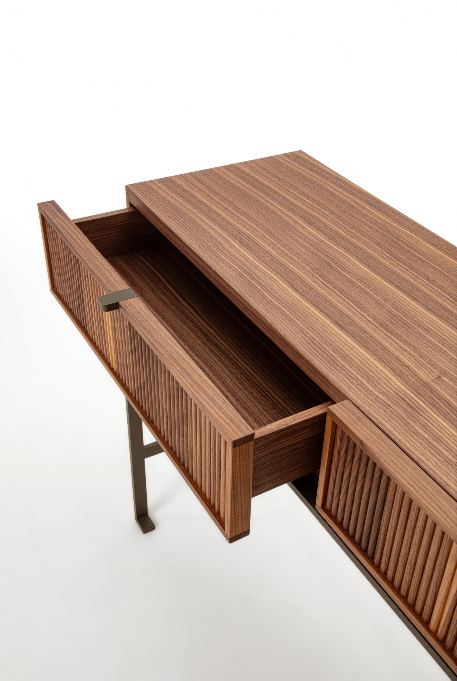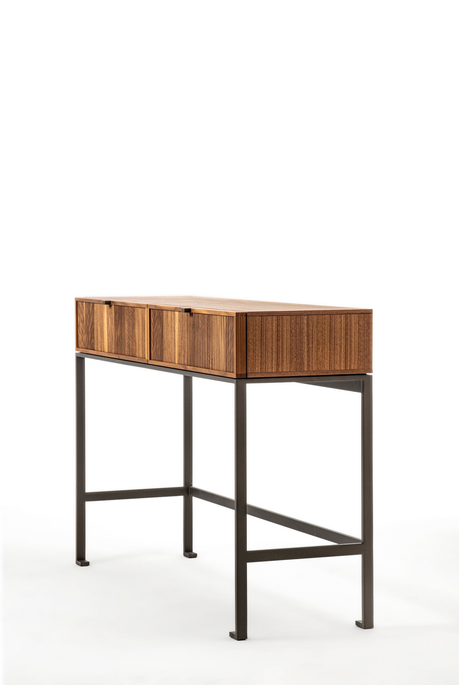 Wood console table with metal base. The top is made of wood, and on the front, it is possible to have two drawers with a canned finish or alternatively two drawers with leather-covered front.