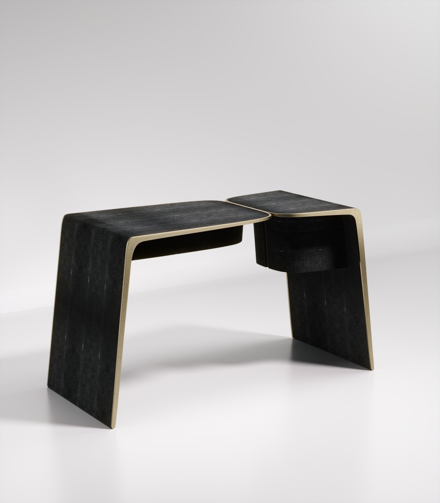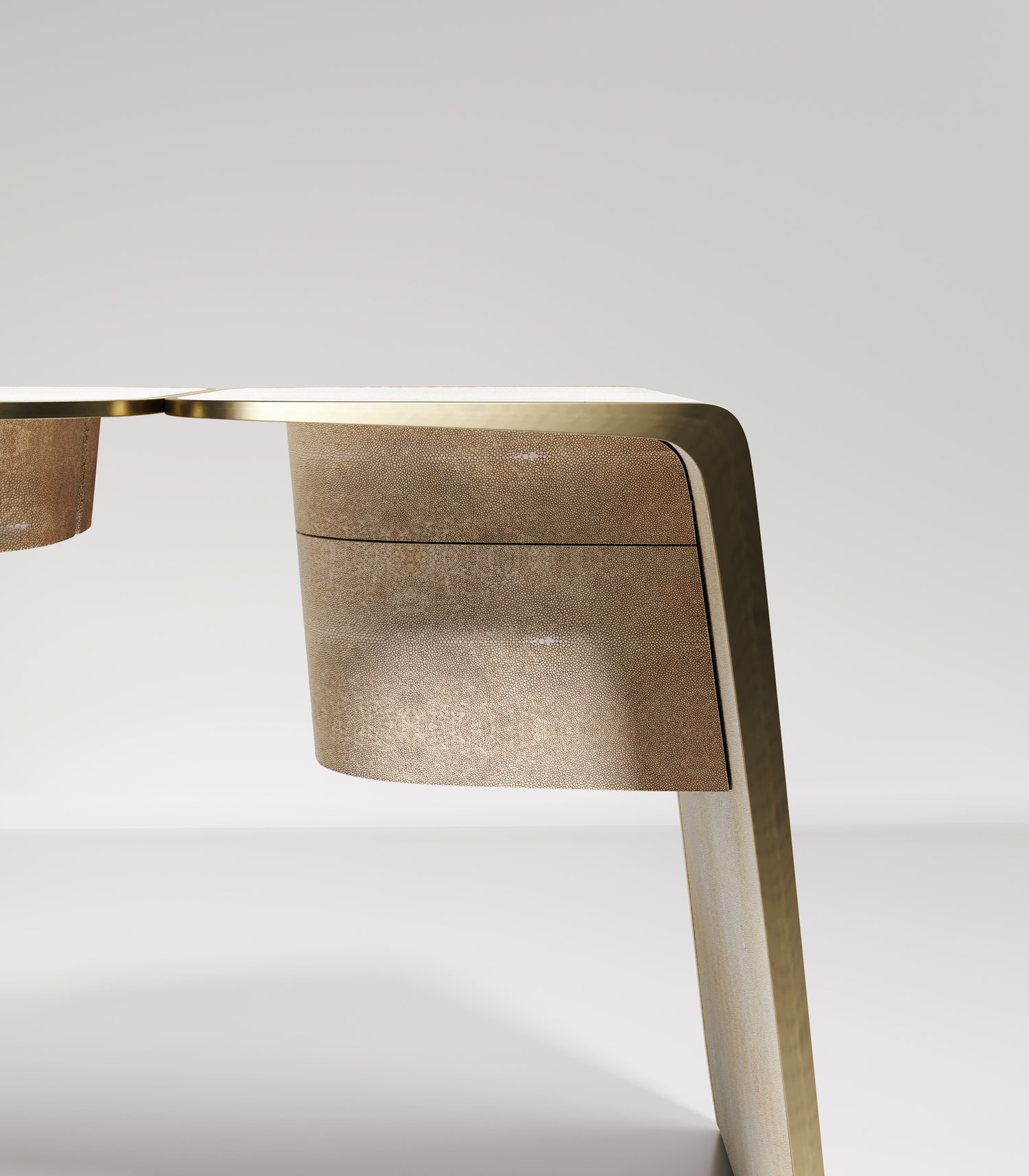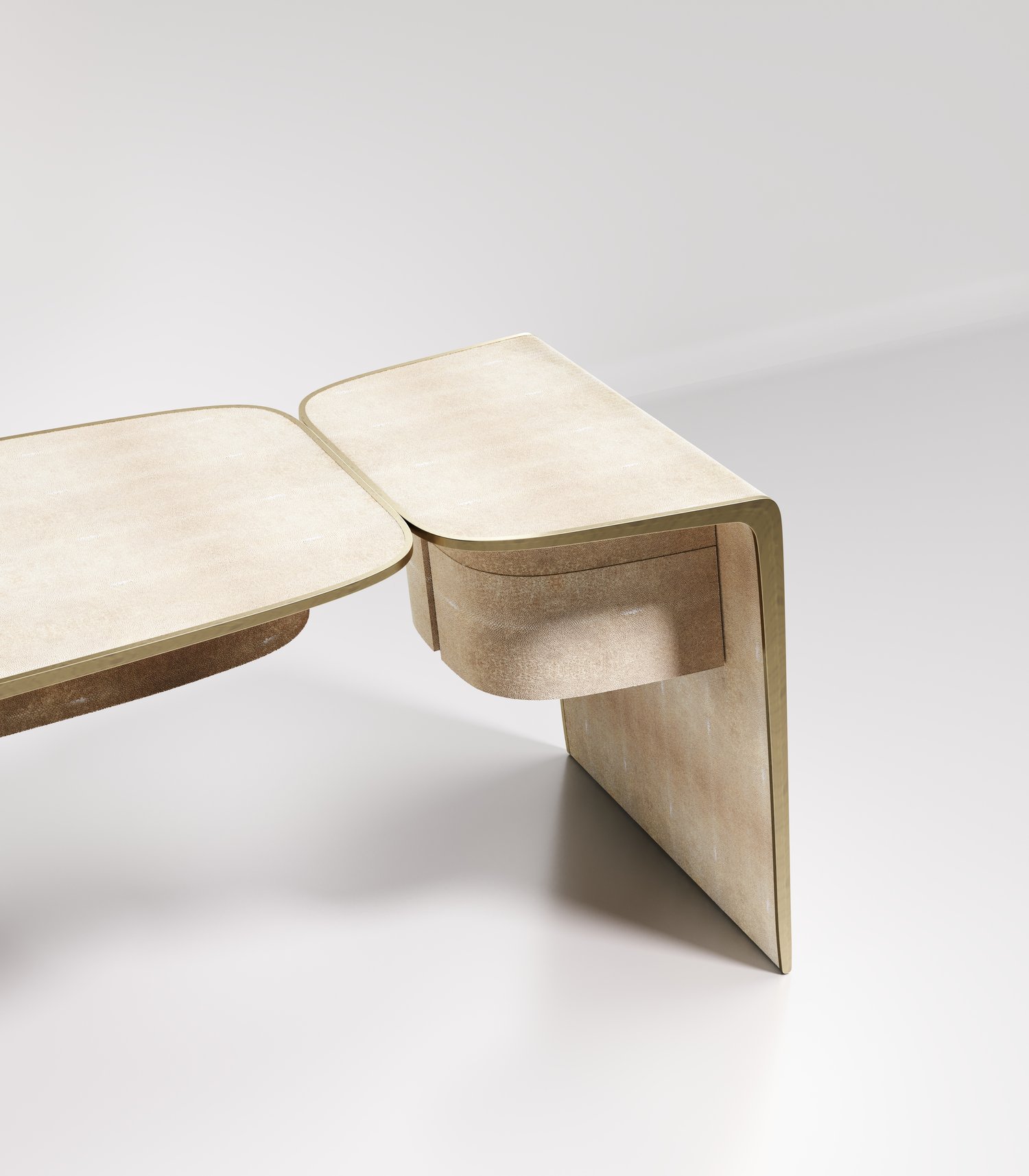 The kiss writing desk by Kifu Paris is an elegant and organic piece in it's unique design. The cream shagreen inlaid piece curves inwards to create the "kiss" effect. The borders are accentuated by bronze-patina brass. This piece includes 3 drawers total. This piece is designed by Kifu Augousti the daughter of Ria and Yiouri Augousti. Available in other finishes. Part of the Kiss Capsule.