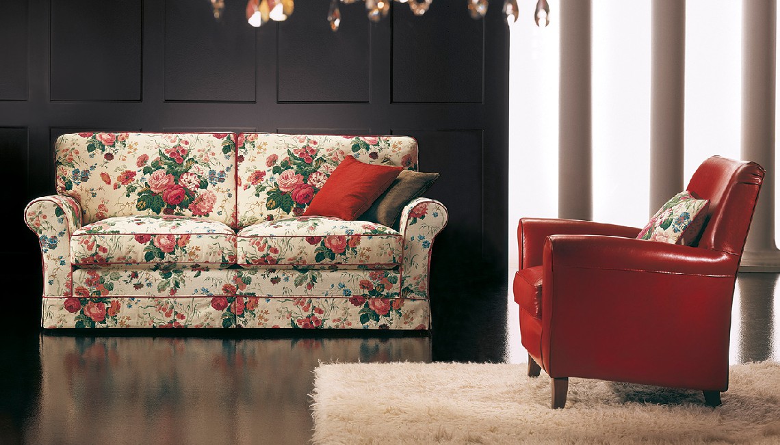 In present day environment everything is mixed in order to find a new meaning, a new order, a new conformation. The classical flowers of Myto sofa, in contrast with the red, very shining leather of Michelle armchair, give life to a very strong idea: merging the desire to relax with the desire of furnish your own private housing space with daring elegance, in a style which speaks about harmony and well-being. Myto sofa is elegant thanks to its smooth lines and comfortable for its wide and soft cushions. It offers the best relax. The coverings can be chosen depending on the fantasy and the personal taste. It can dress every kind of weave, from plain color to the extreme art nouveau, and it can be inserted in the more particular environments. It can be matched in extreme harmony with Michelle armchair, which is simple in the shapes and unique in the comfort.