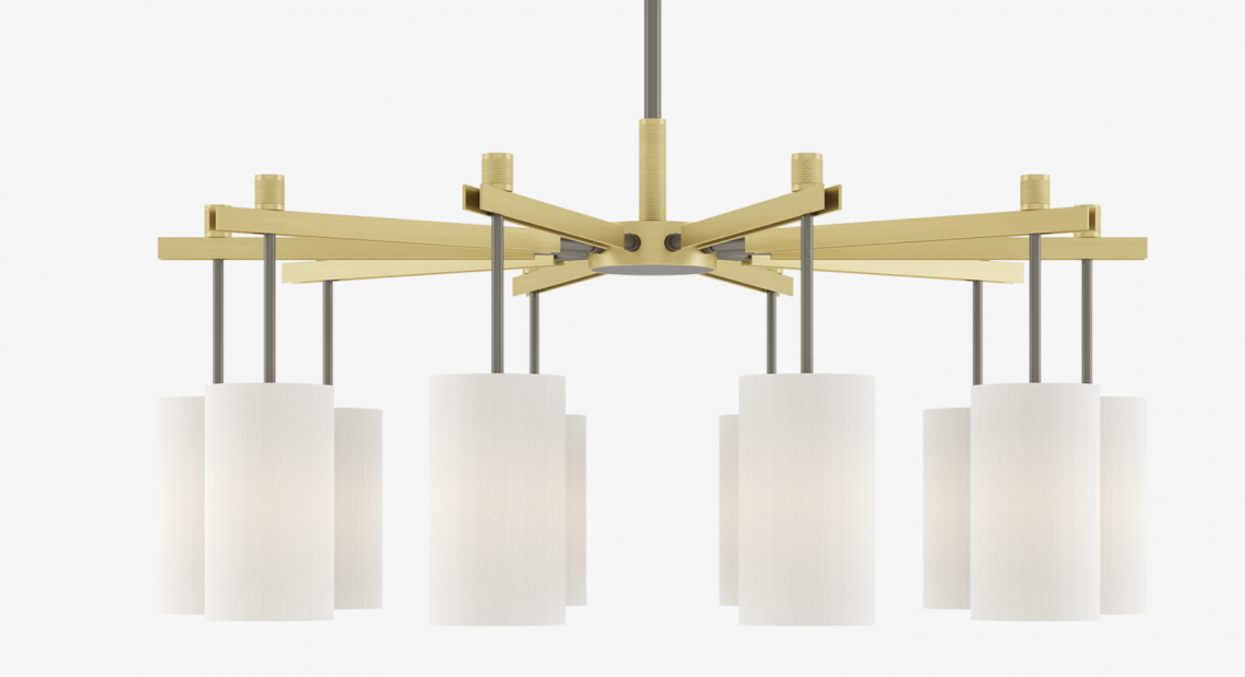 A blend of brushed, knurled and oxidised brass, the chic ZURICH ceiling lamp showcases one material in several ways. Its central stem emanates outwards into ten arms, each of which suspends a cylindrical double silk shade,