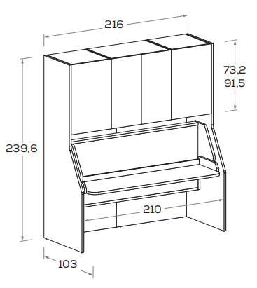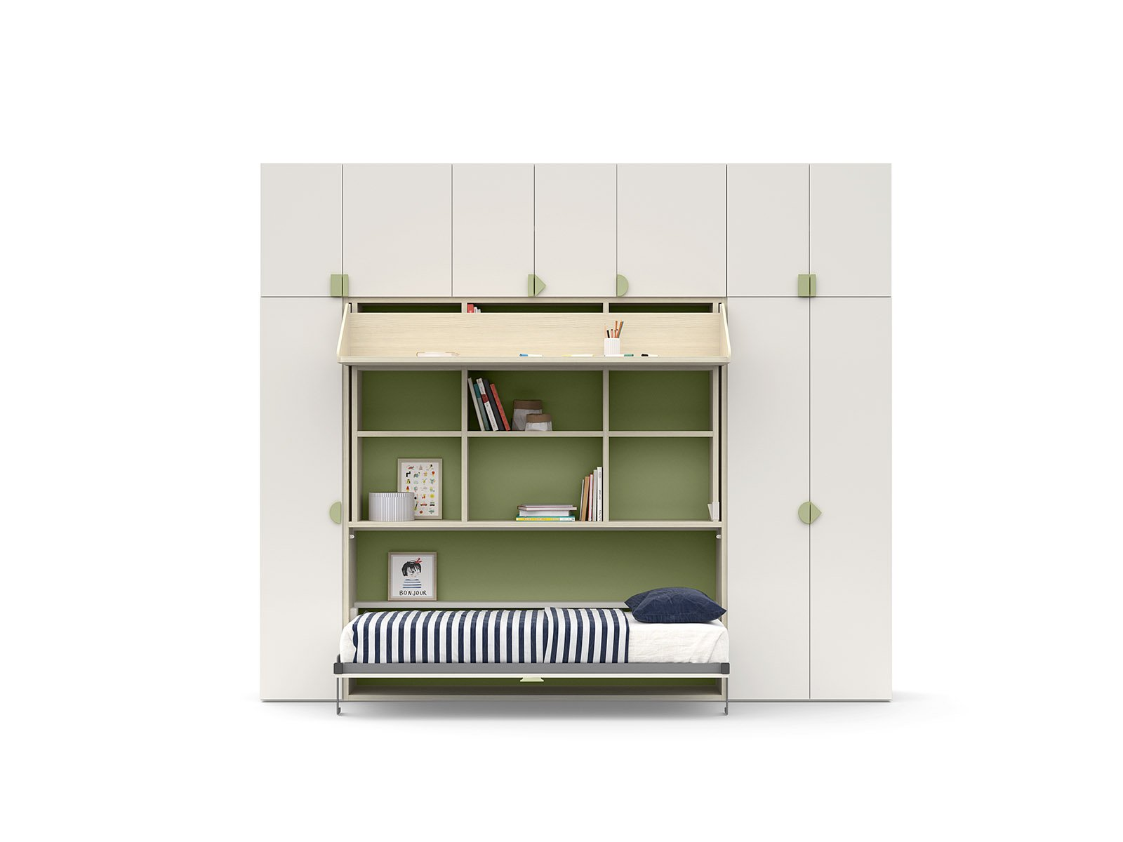 Con i suoi fianchi sagomati più larghi alla base, il ponte Tippy accoglie un letto, uno scrittoio o entrambi. E grazie al meccanismo, lo scrittoio lascia spazio al secondo letto senza dover spostare nulla.
