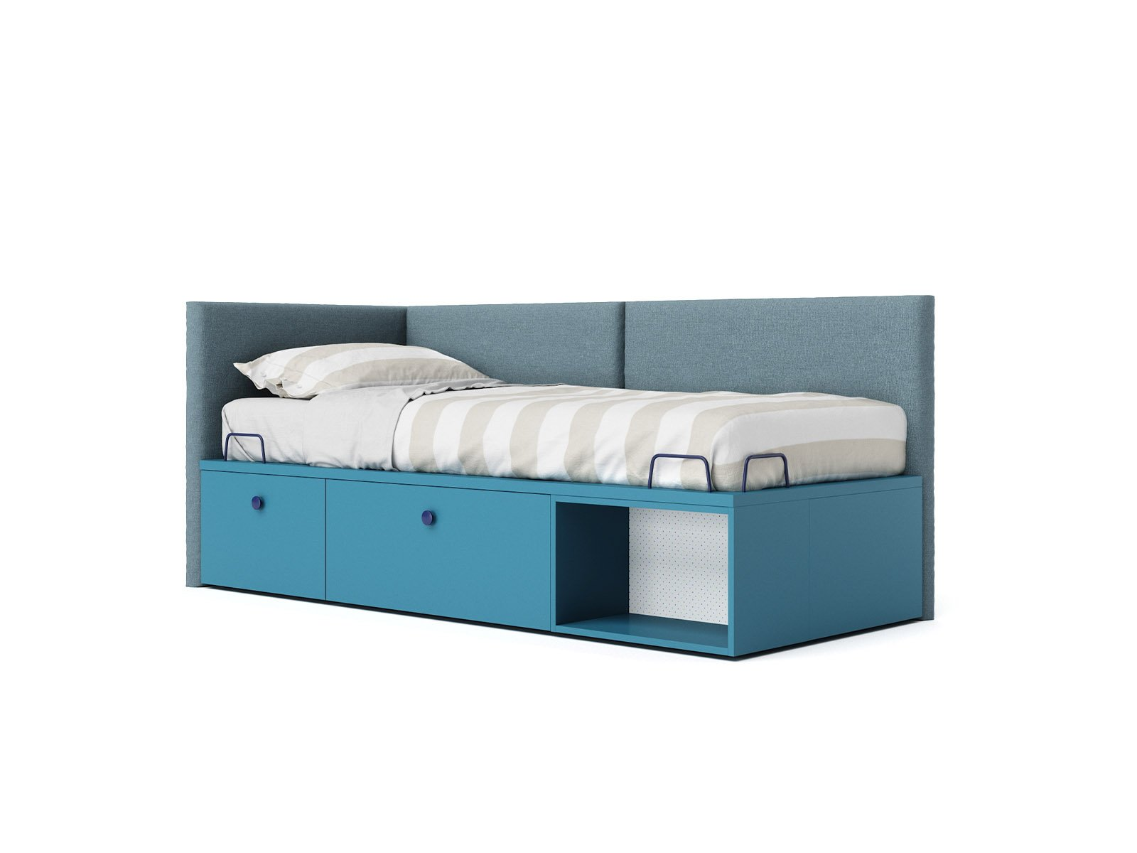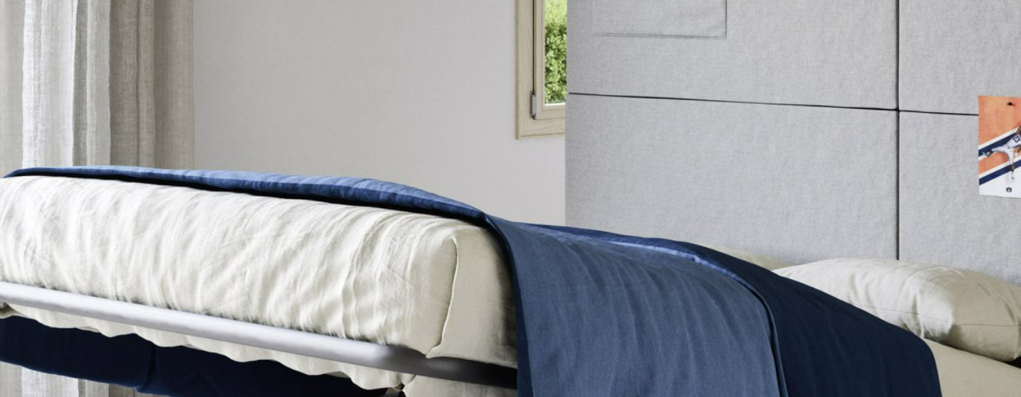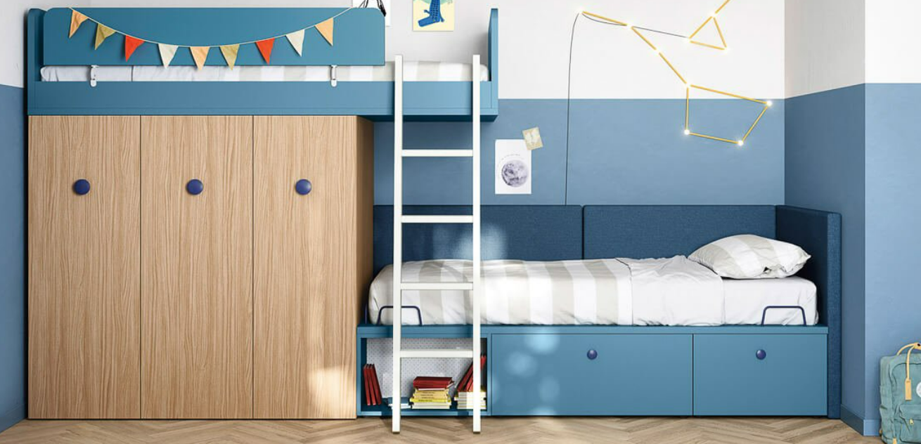 Con i suoi fianchi sagomati più larghi alla base, il ponte Tippy accoglie un letto, uno scrittoio o entrambi. E grazie al meccanismo, lo scrittoio lascia spazio al secondo letto senza dover spostare nulla.