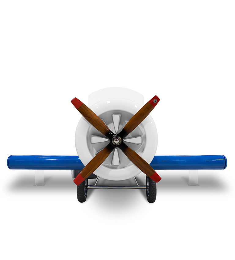 The body is entirely made of fiberglass with glossy varnish applied and chrome plated finishes in the engine and wheels. The decorative suitcases include secret storage compartments and allow an easy access to the bed. The Sky One Plane makes the crib-to-bed transition as painless as possible.