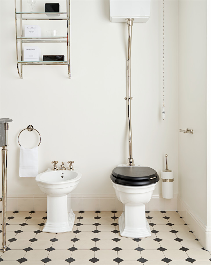 The quintessence of classicism for a bidet with external irrigation and 1 or 3 holes in fine white procelain, inspired by the purest British style.
