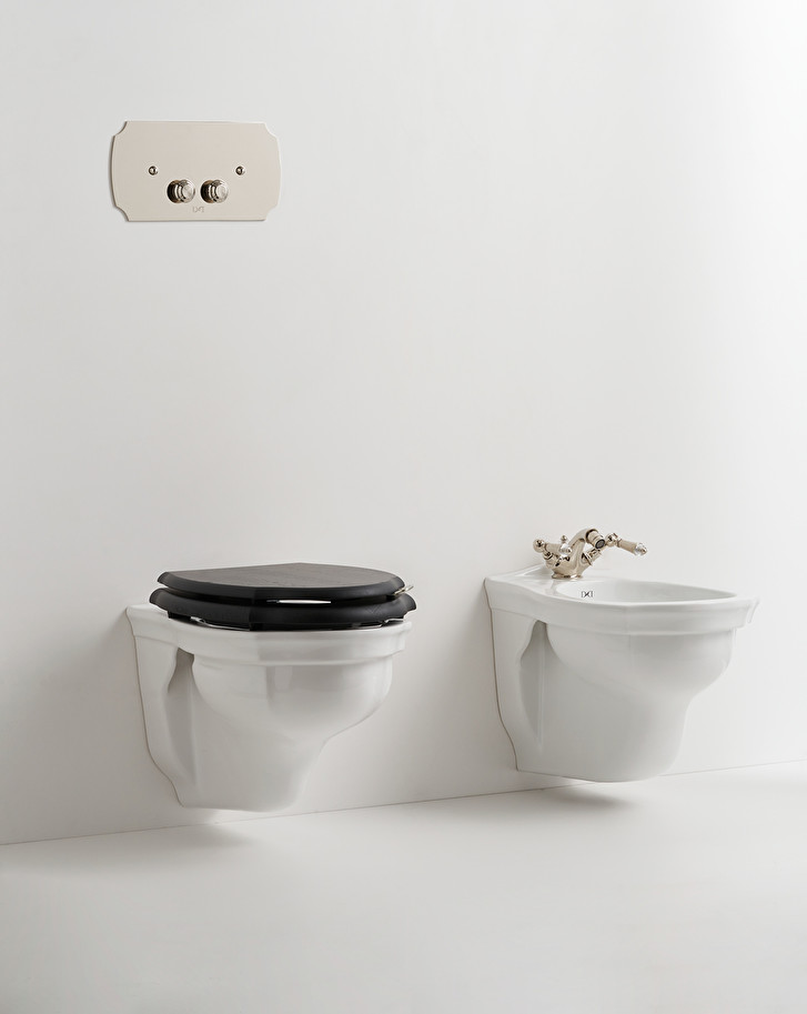 The quintessence of classicism for a wall-mounted W.C. pan in fine white porcelain, inspired by the purest British style. It can be coordinated with a large collection of toilet seats in different materials and colours.