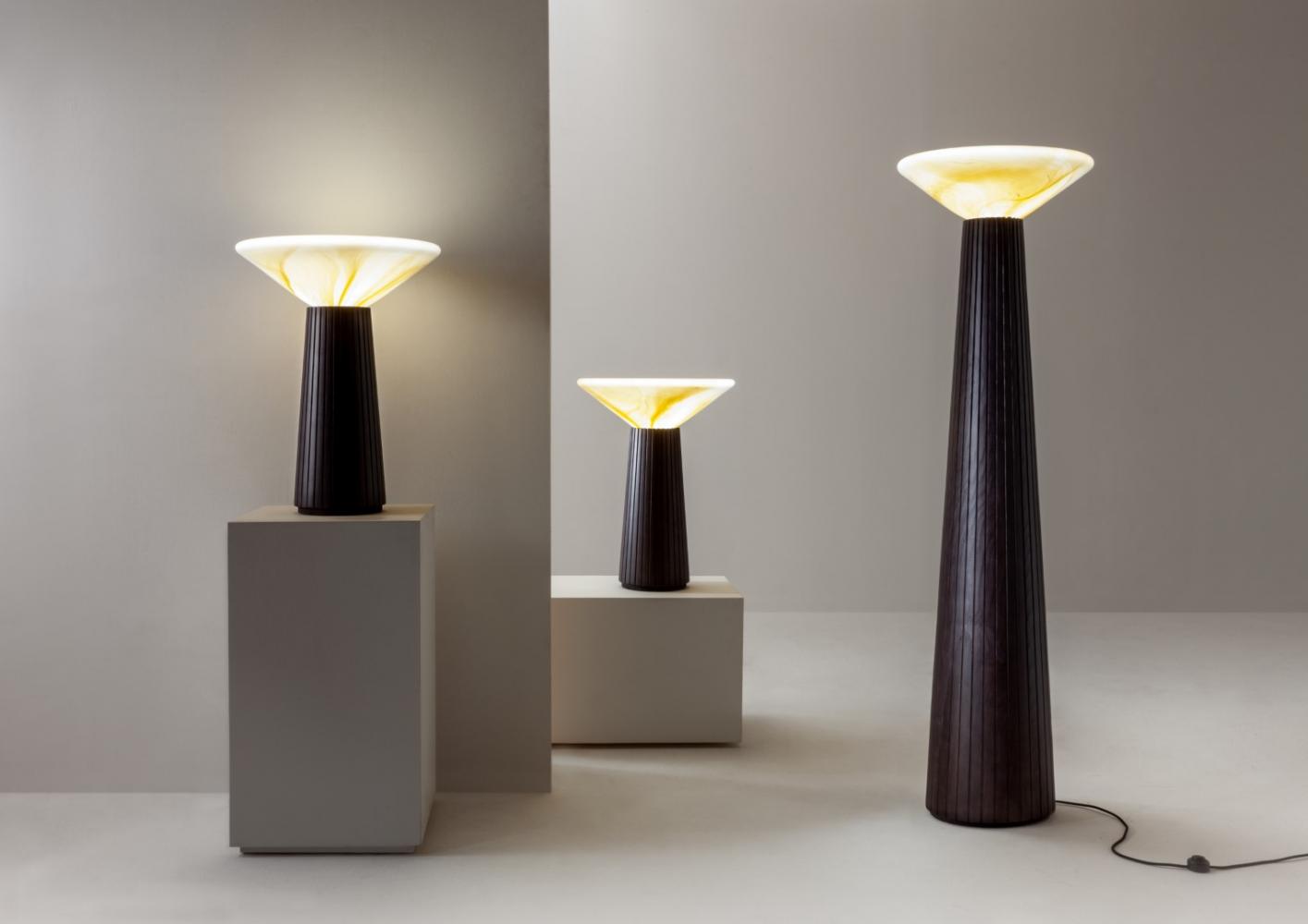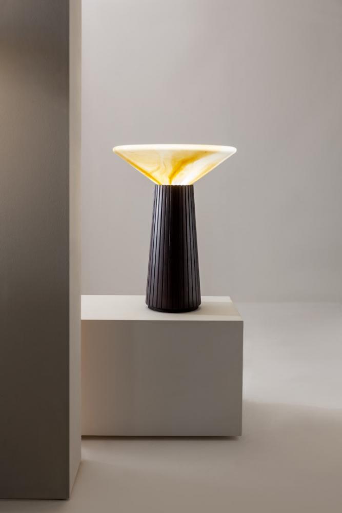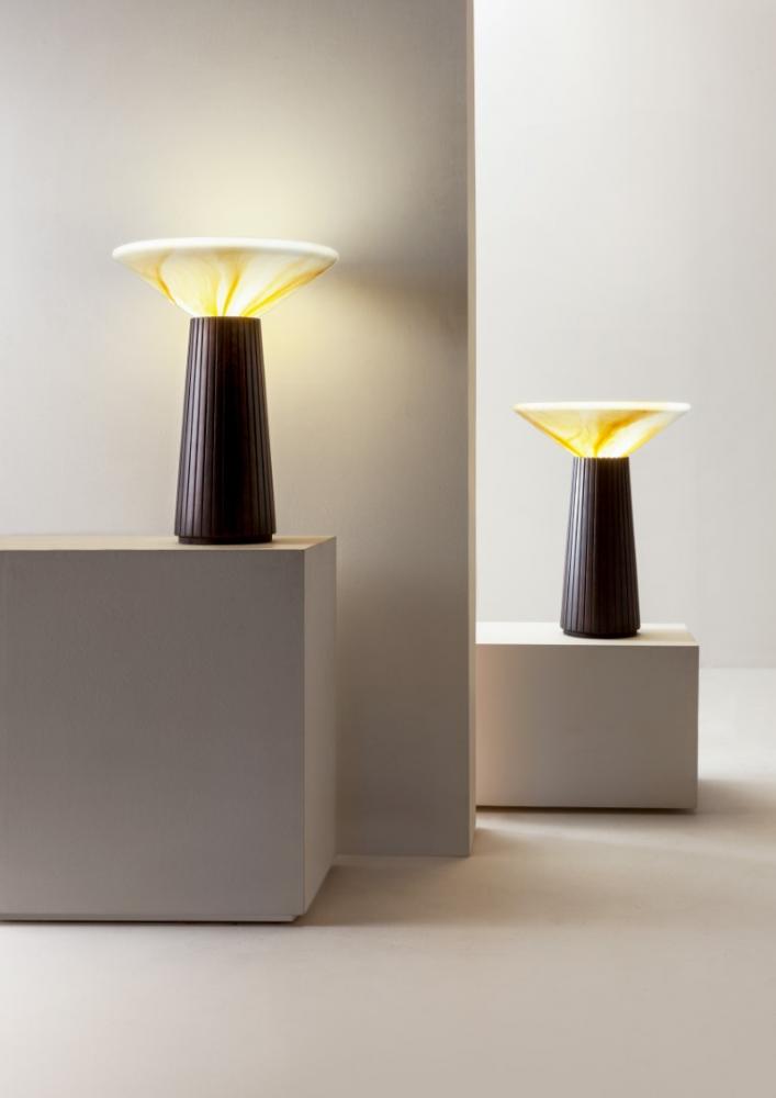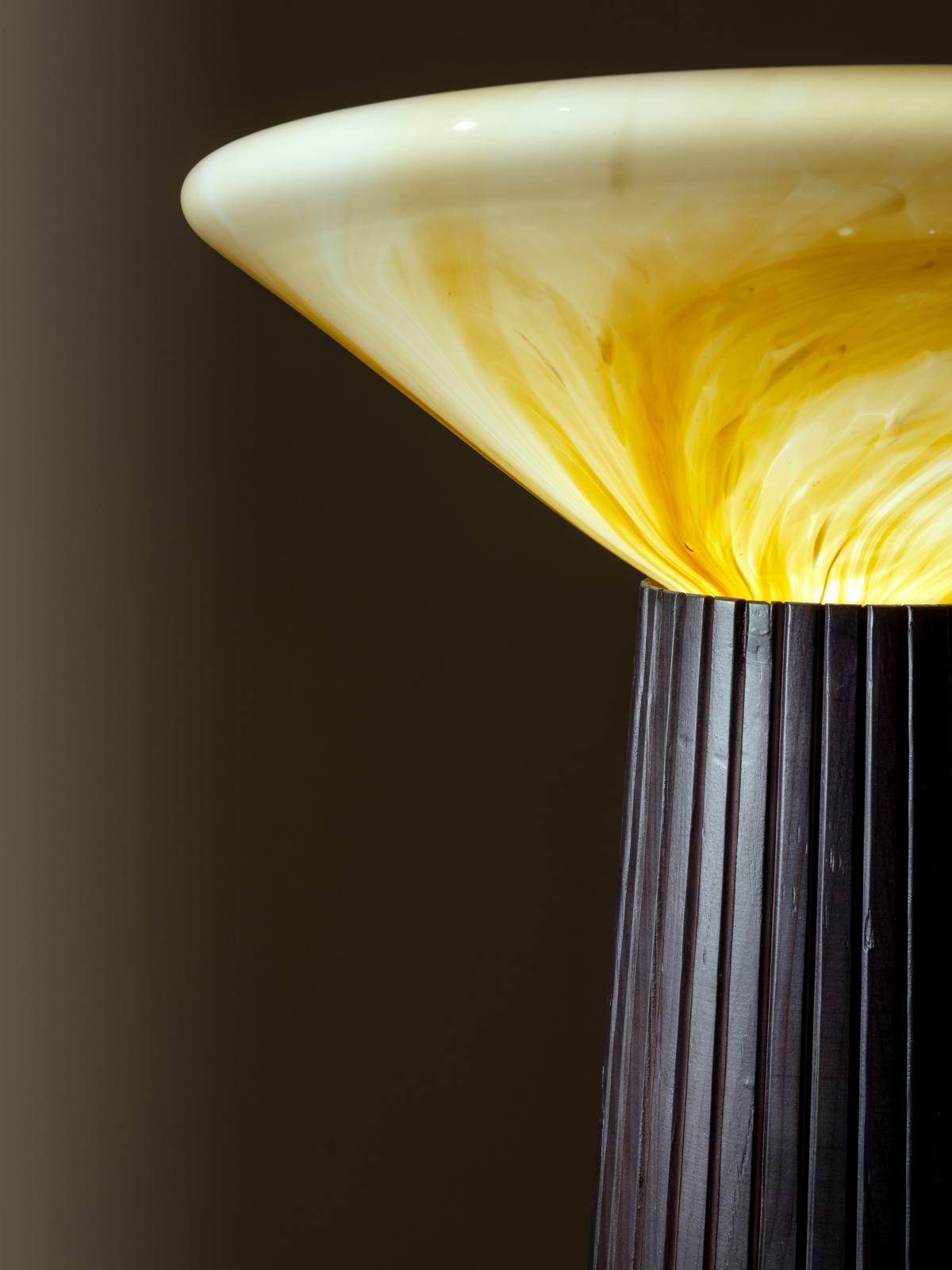able lamp consisting of a solid stained fir wood structure and with a sculptural lampshade in mouth-blown Murano glass.