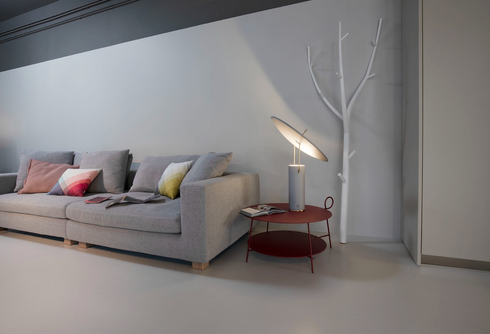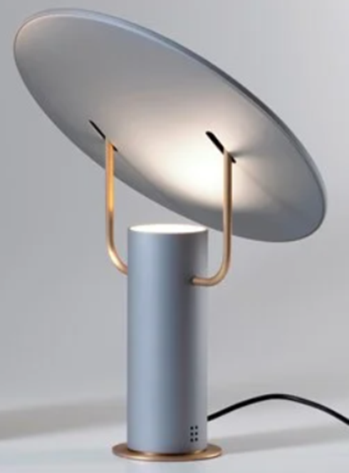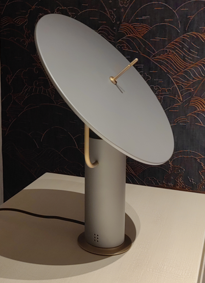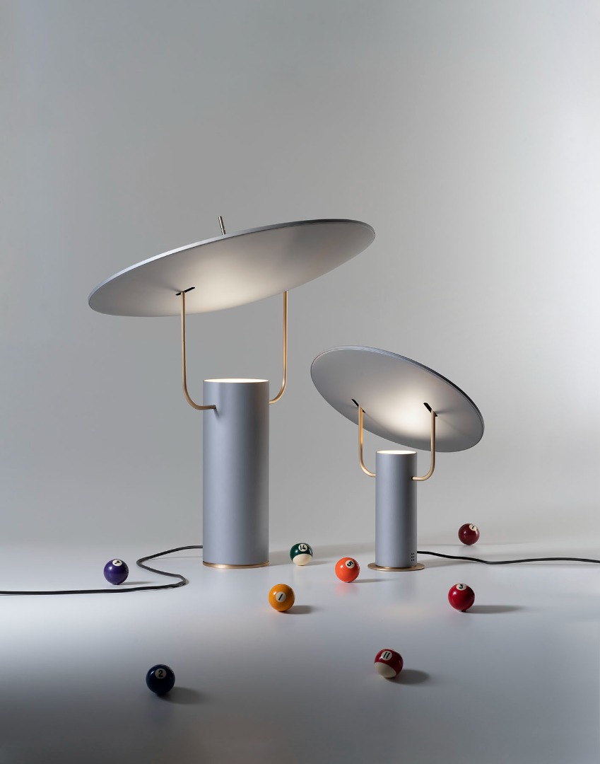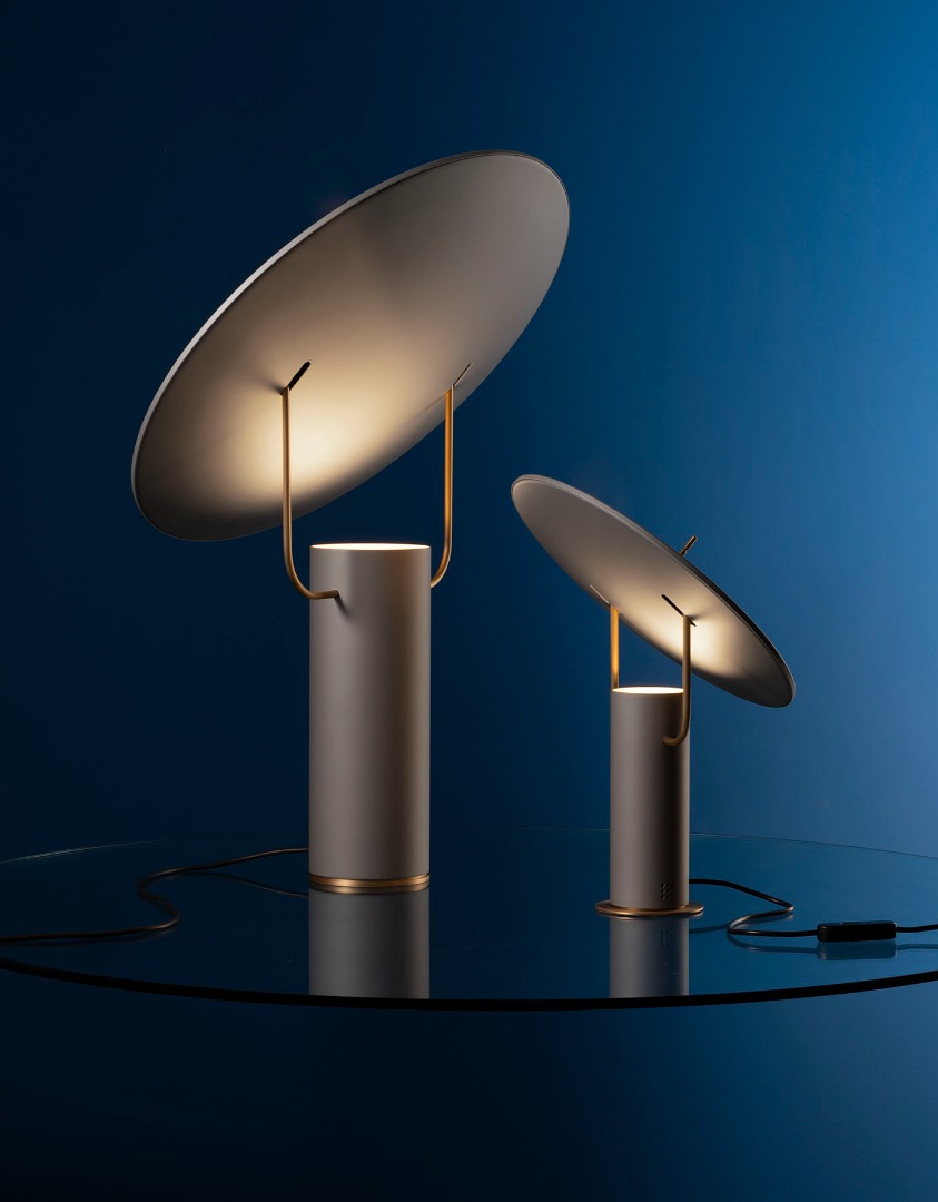 An allusion to satellite dishes and to space. A white or multi-colored light reflects on the adjustable curved surface supported by two light chromed arms and lights in a diffused way with games of light and shadow on the environment surrounding you.