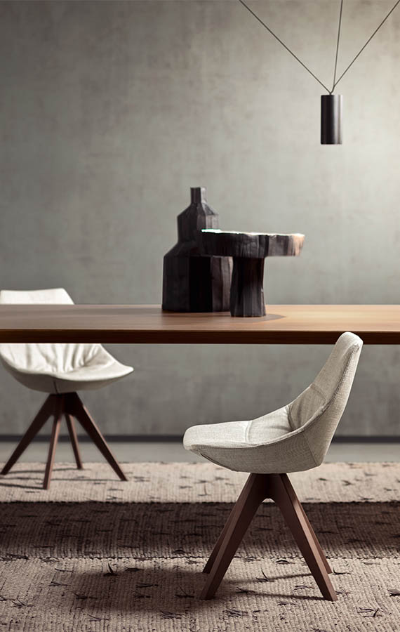 The broken lines and the vivid colours enrich the differences between the bases, which are light and steady. The signature feature is its seat: the shape, reminiscent of the cross-section of an egg, is designed to be comfortable and cocooning, in both the rigid lacquered version and the padded version with non-removable or loose covers, available in fabric, leather and synthetic leather. The base is the variable and comes in three versions: metal pylon, solid wooden slanted legs and tubular base.