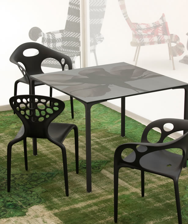 Design polisensoriale, linee da accarezzare, da leggere al tatto e da ri-elaborare continuamente. Le forme sinuose si irradiano dal telaio-struttura allo spazio circostante. Pieni e vuoti, assenze che diventano presenze nell’attraversamento della luce, del vento, del corpo. I fori dello schienale, come uno schermo poroso, creano seducenti giochi di ombre, rimando alle geometrie disegnate dai raggi solari filtrati dalle fronde degli alberi.