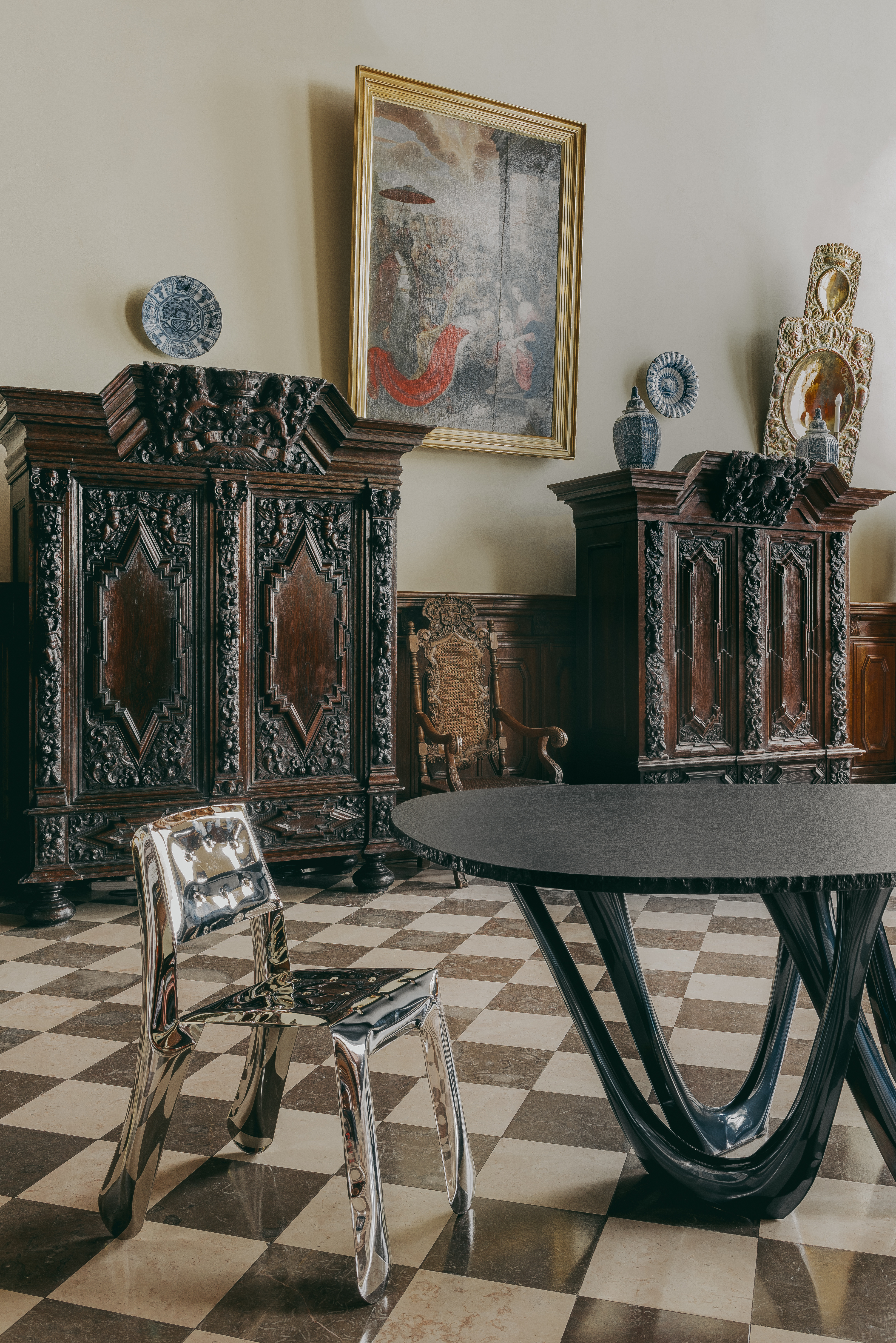 A development of the limited edition Chippensteel 0.5 chair – available in new colours. It still offers a unique material experience but the shape of the chair has been slightly redesigned to allow a mass-production. The chair has been uniquely processed and produced in FiDU technology using bending properties of steel sheets.