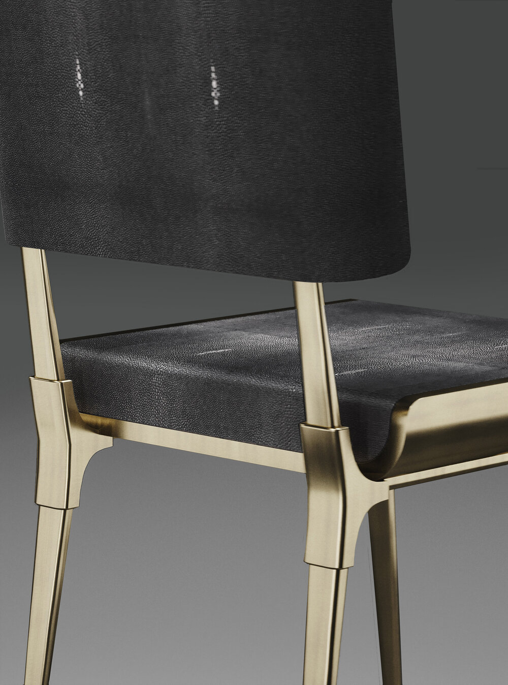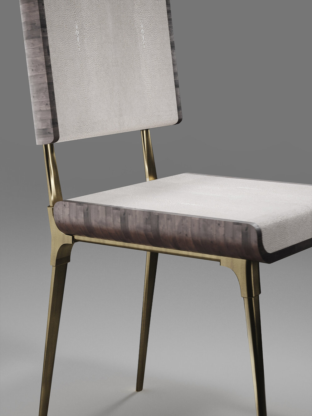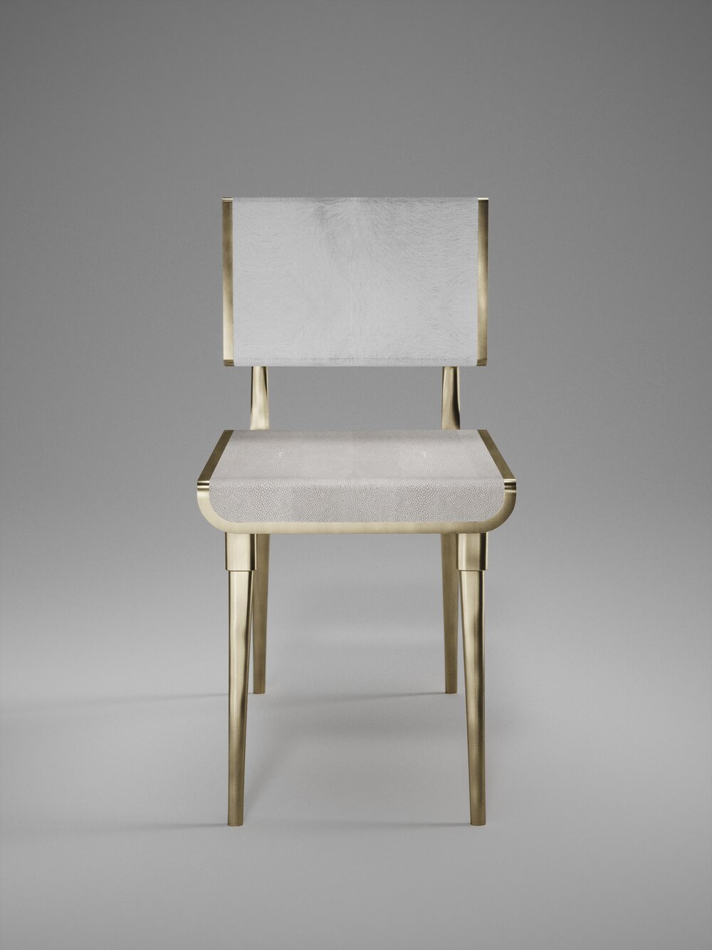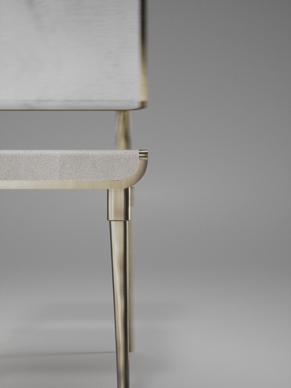Inspired by the original Dandy Bench by KIFU PARIS, the Dandy II Chair is the ultimate luxury seating for a dining room or corner area. The seating area is inlaid in cream shagreen and the legs, frame and sides of the chair are inlaid in bronze-patina brass. The backrest is upholstered with white vachette. Other versions are also available as part of the Dandy II Capsule.