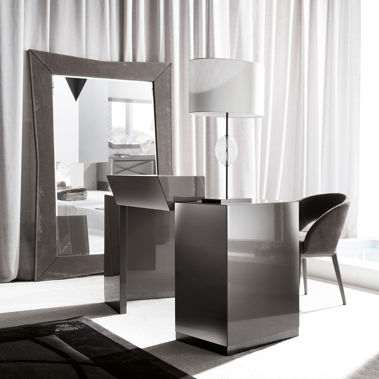 Vanity desk in high gloss polyester grey lacquer w/4 with fronts in natural protected nubuk leather, botton part in velvet fabric. Bases and handles bin black nickel steel.