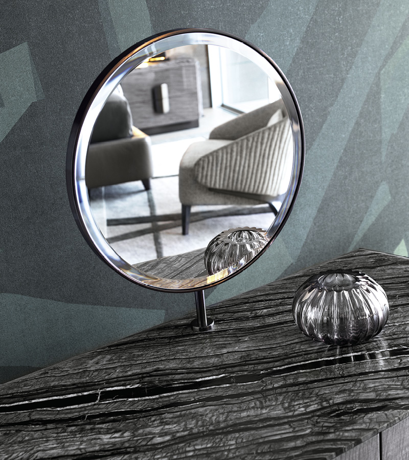 Vanity desk in Madagascar figured Mowingui veneer in high gloss polyester finish. Top in Kenya black marble. Curved legs in satin black nickel stainless steel with lasered Giorgio Collection logo. 2 center full extension drawers with bottom part in velvet fabric.
