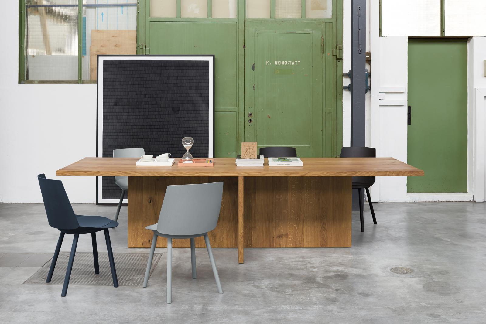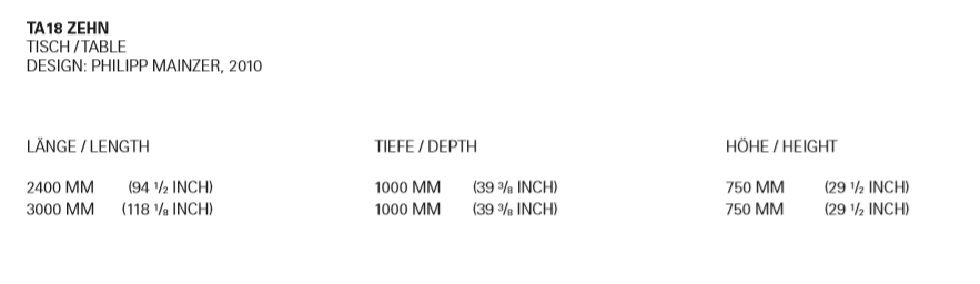 The table ZEHN has through the complete reduction to its geometric form a sculptural appearance. Due to its simple middle leg, which dependant on the length of the table, is symmetrically positioned underneath the table top, the usual protruding stilts are omitted. With a solid wood thickness of table top and leg of 40 MM (1 5/8 INCH), ZEHN is available in oiled European oak. Its reduced form enables the table to suit various interiors as a conference or dining table. ZEHN offers seating for up to eight people with a length of 2400 MM (94 1/2 INCH) and up to ten people with a length of 3000 MM (118 1/8 INCH). The table ZEHN is perfectly complemented with side chairs HOUDINI or THIS. The clearance underneath the table top measures 710 MM (28 INCH).