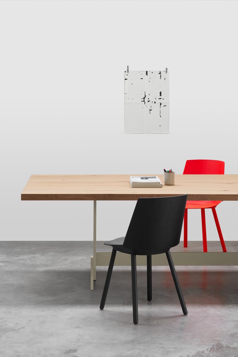 In his search for an ergonomic, organic seating shell without involving expensive tooling Stefan Diez was inspired to apply techniques used for the construction of wooden gliders and airplanes. The result is an original silhouette, couture inspired construction and colour palette including neon red that have since made HOUDINI a design classic, and an identifiable icon for e15.