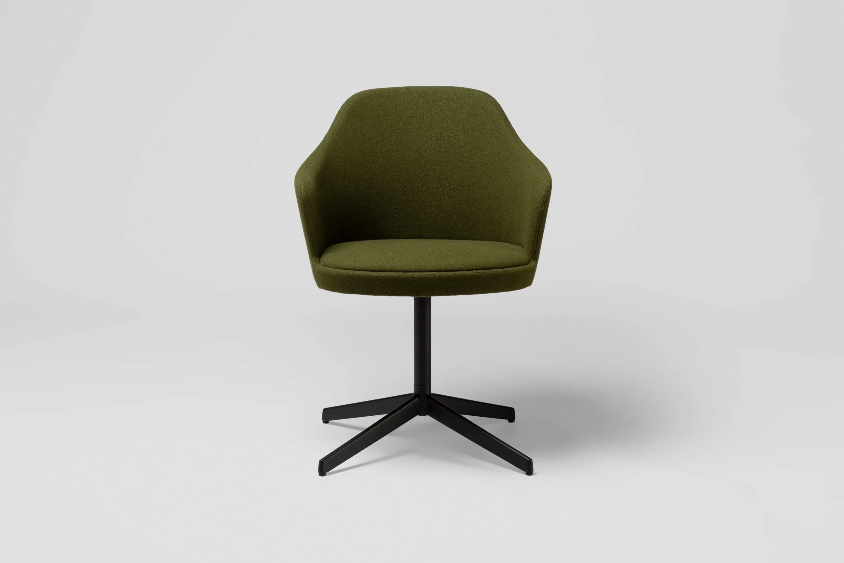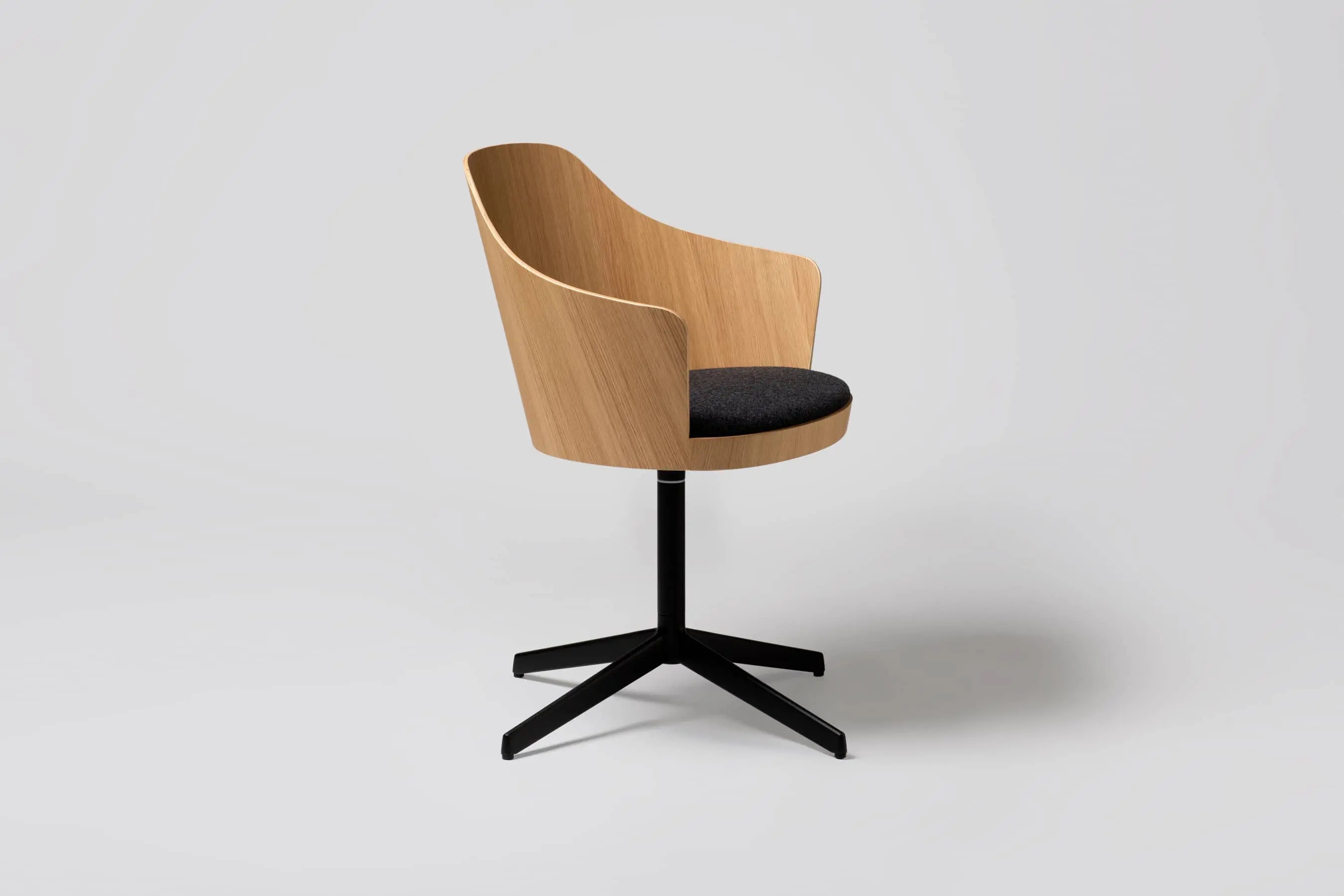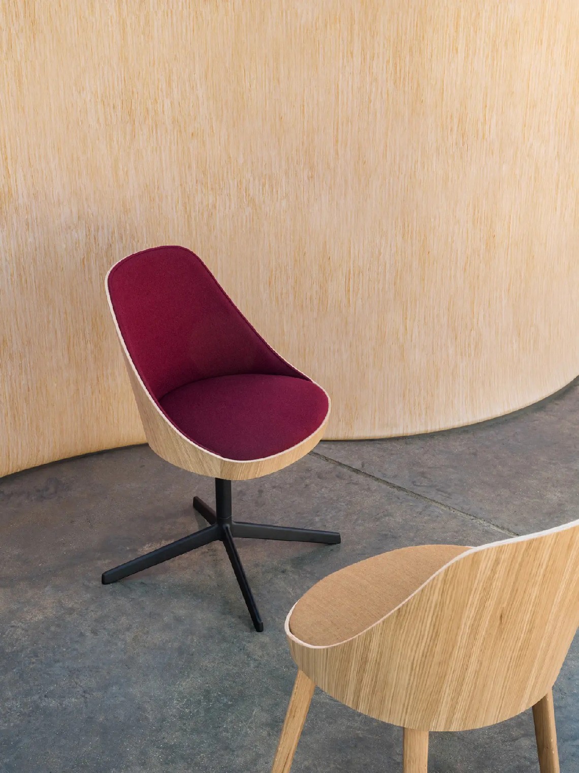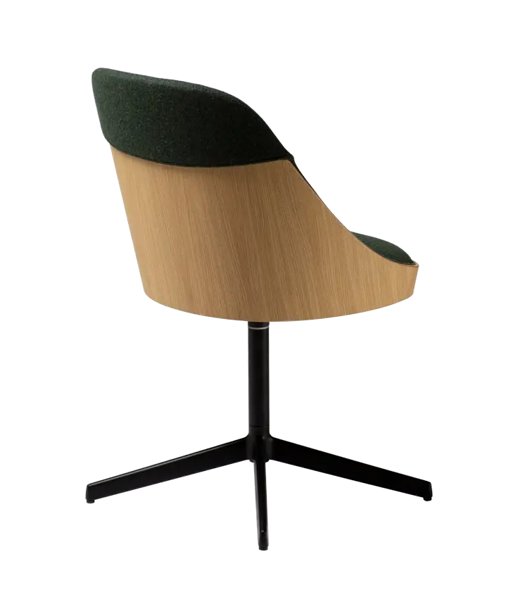 The shell of Kaiak confident chair, available with or without arms, is made of natural or stained oak wood and it has a broad range of upholstery options available: fully upholstered, upholstered seat, three quarters upholstered and inside upholstery. Its 4-star swivel structure can be lacquered in any of our colours.