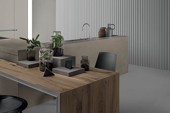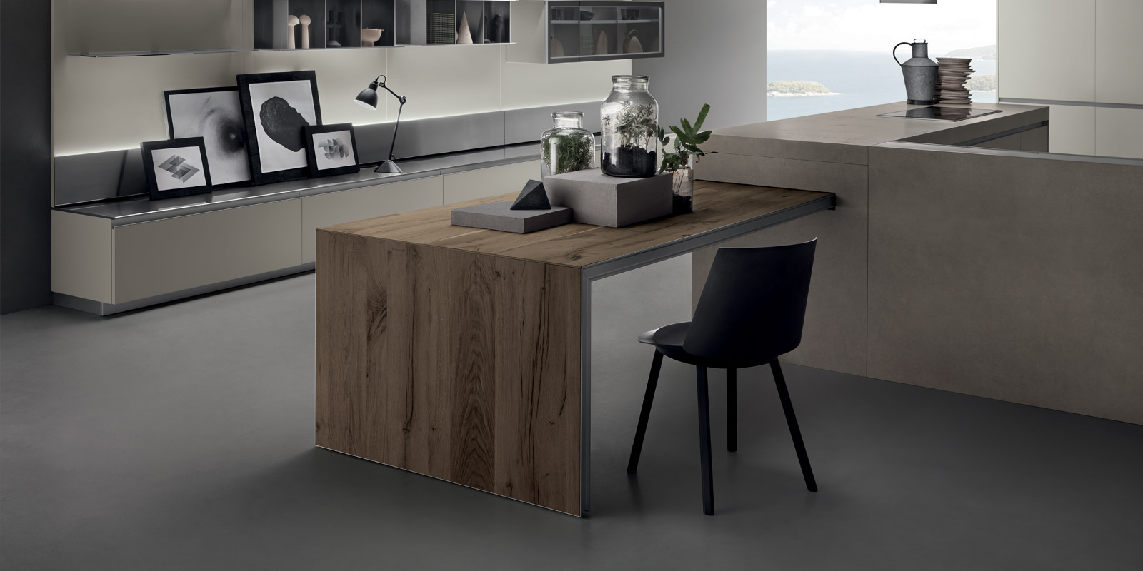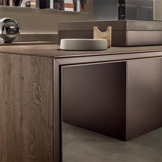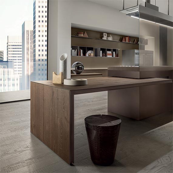 滑動島臺采用多節的橡木飾面,鋁漆結構呈現棕色金屬效果。