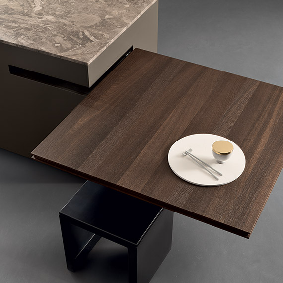 多節 Terra d'Ombra 橡木材質的旋轉桌。臺面選材為經熱處理的橡木,框架采用 Mocha Flat Matt 噴漆處理。