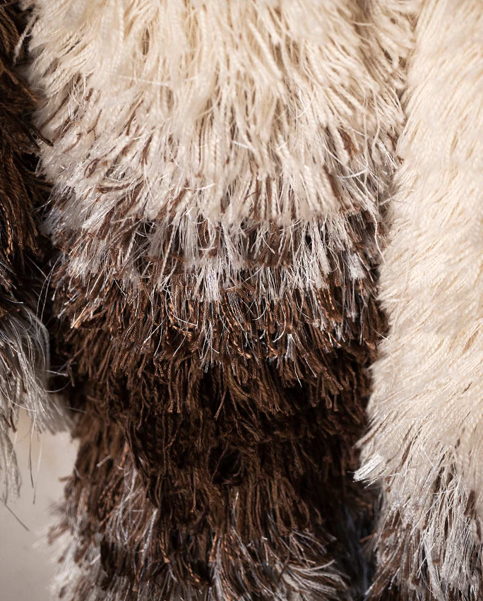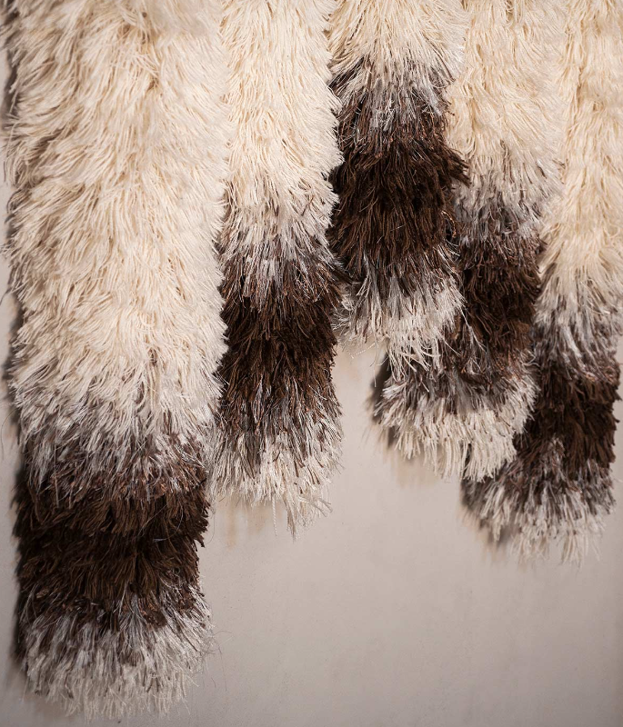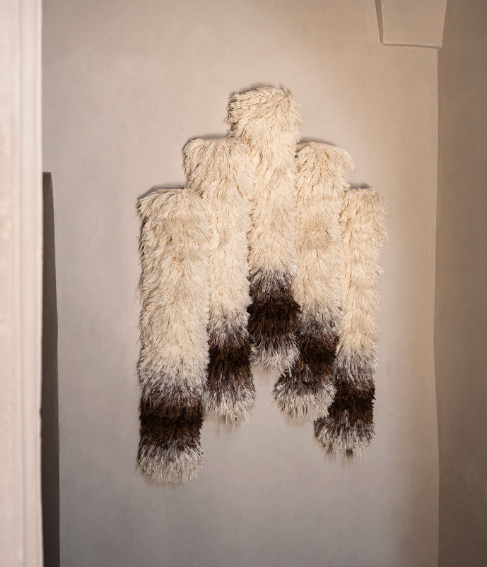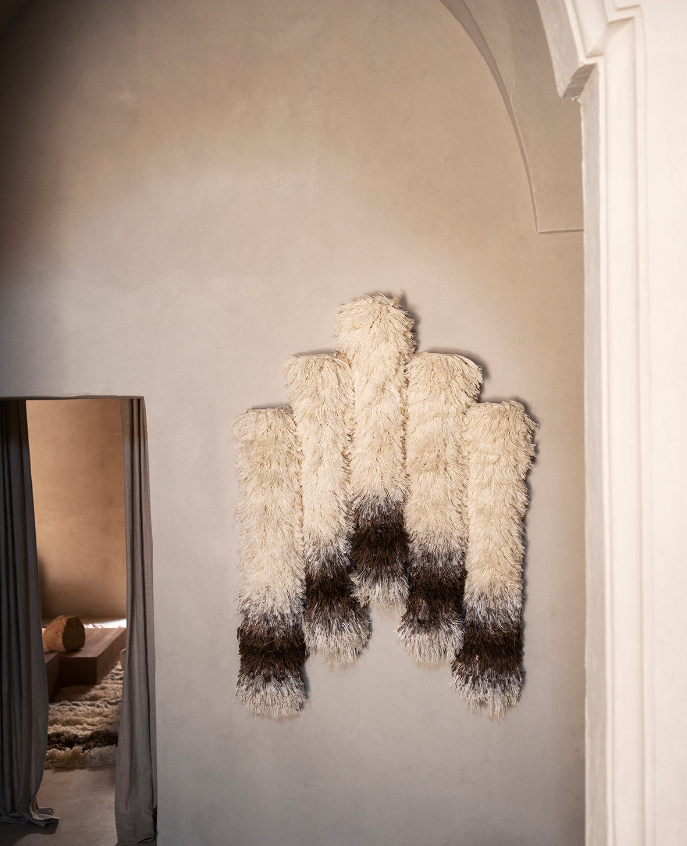 In German, “leise” means silent. Inspired by the warmth and quiet that tapestries have given to interior spaces for centuries, Salem van der Swaagh created a wall hanging for Tacchini that fuses tactile and visual sensations in a textile work that invites slow, silent exploration. Leise takes shape from a meticulous manual knotting technique that defines its volume and texture – from the rich white tones to the ends that seem almost immersed in gold – in a tonal and material transformation that creates a rich and harmonious contrast. An invitation to slow and silent exploration to grasp the poetics of tactile sensations in a continuous balance between wild and tamed, raw and worked.