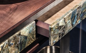 Consolle in essenza, 2 cassetti, dettagli in acciaio effetto satinato opaco o spazzolato.