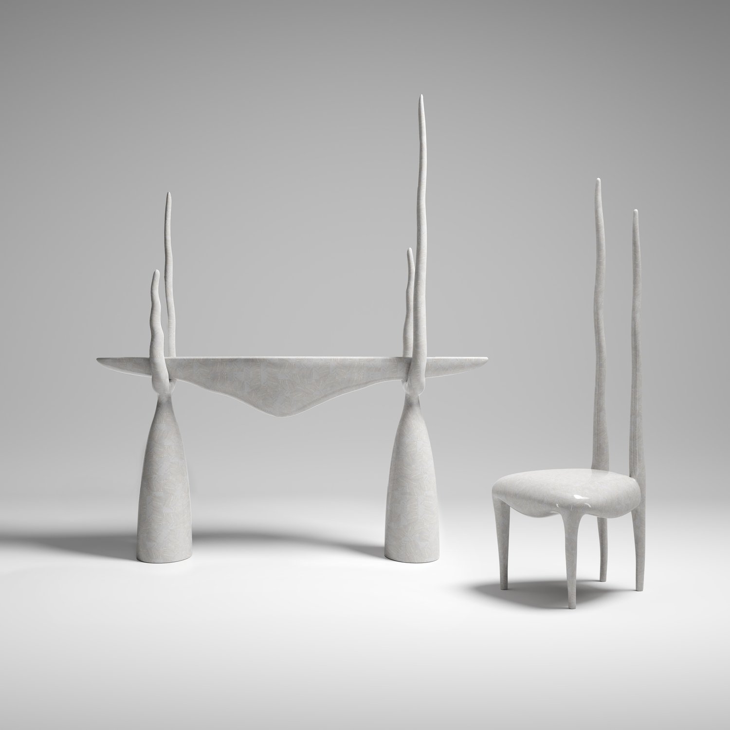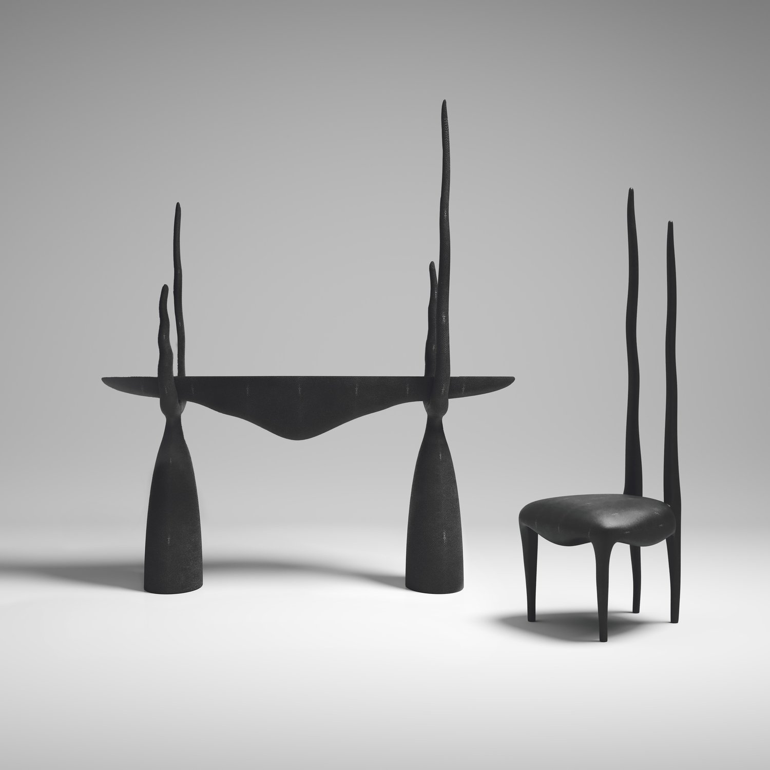 The Sylvie Console is an ethereal and sculptural piece. This table is inspired by the iconic Sylvie Chair by R&Y Augousti; one of their very first designs, paired together create a majestic and stunning statement in any space. This piece is shown in black pen shell, but custom color or sizing are available on request. The cream shagreen version and black shagreen version can be seen at end of image slide.