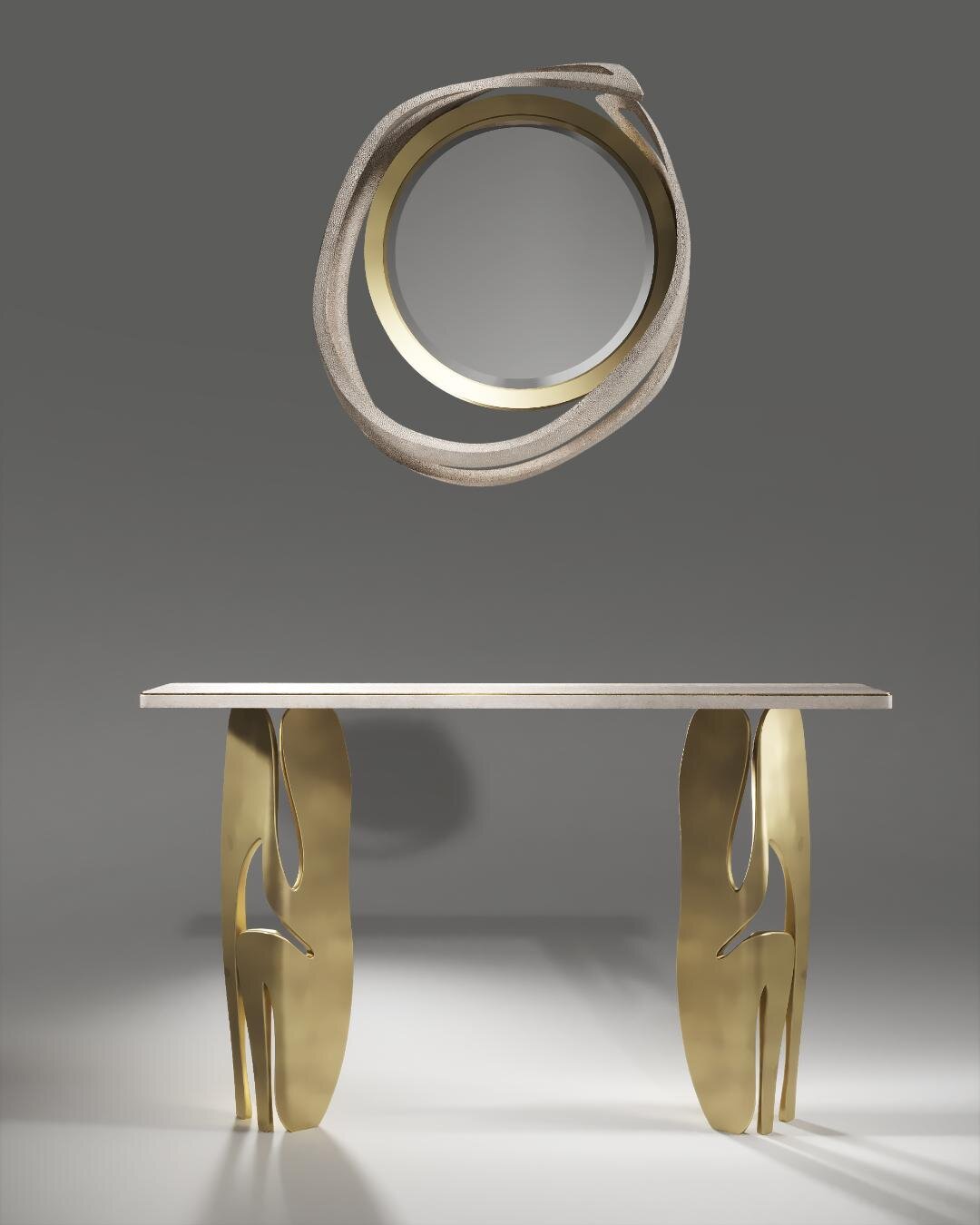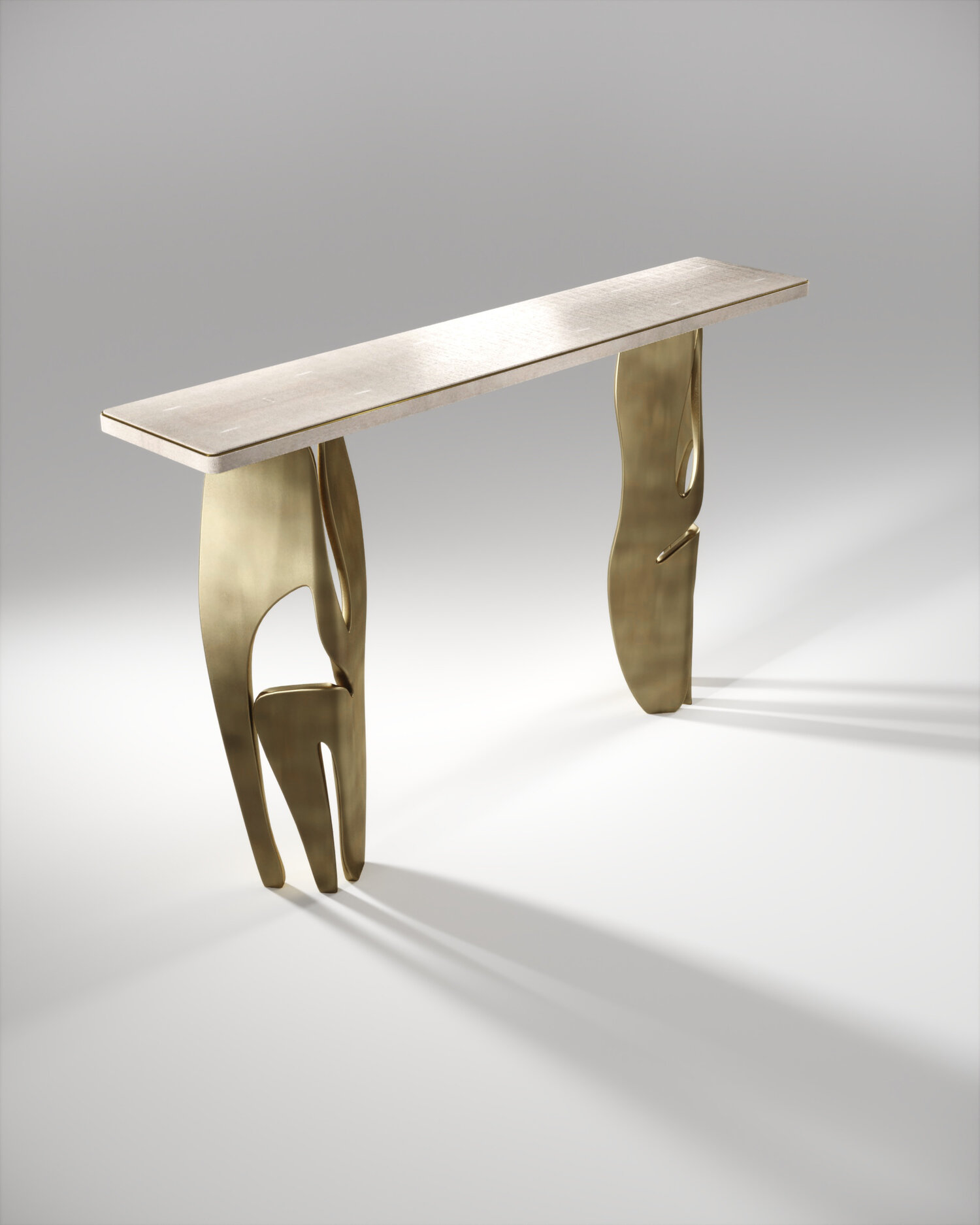 The Metropolis II console by R&Y Augousti is a statement piece. The cream shagreen inlaid top sits on a pair of dramatic sculptural bronze-patina brass legs, showcasing the brand's incredible artisanale work. The top has a discreet metal indentation around the border, adding another elegant and luxurious element to the design.