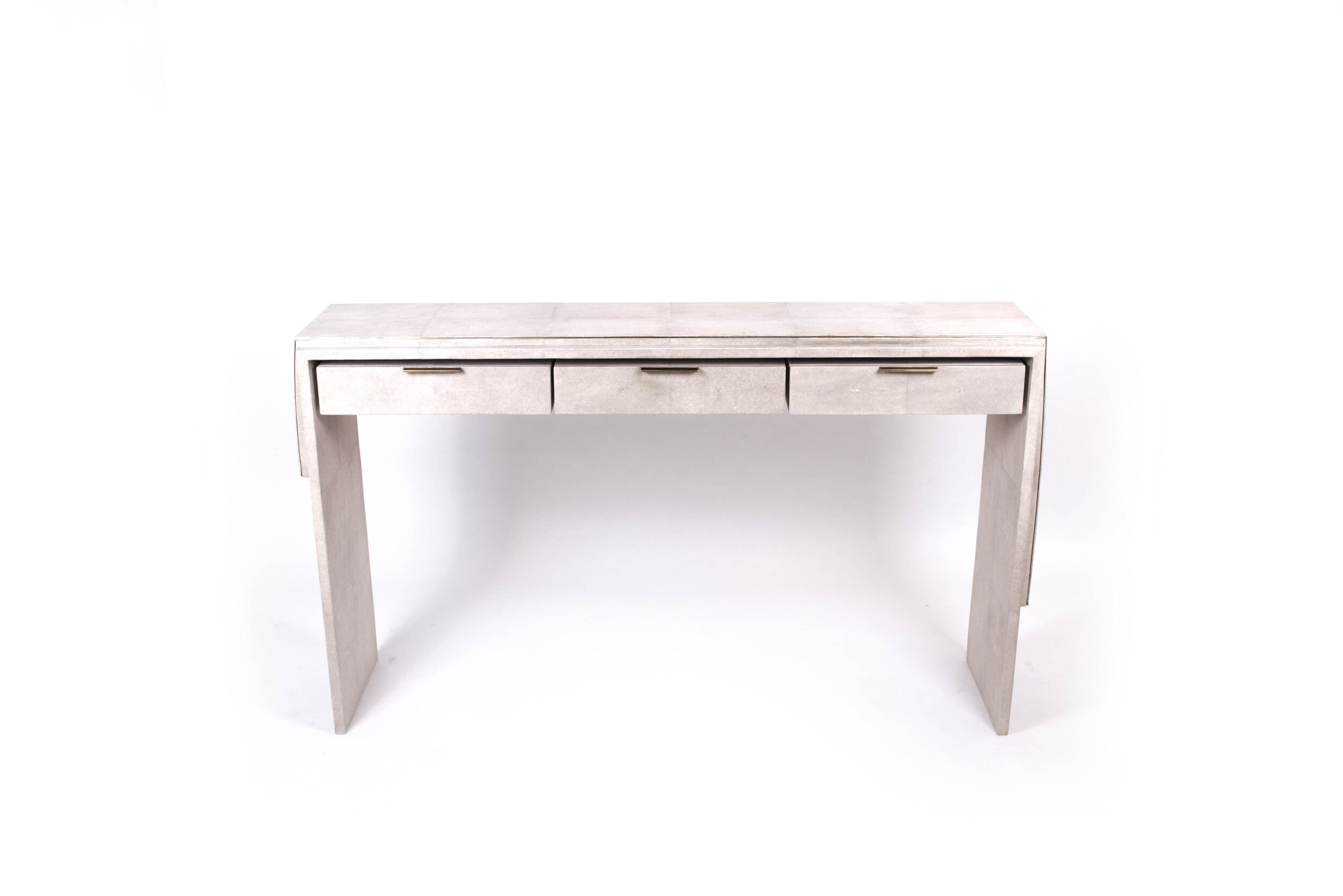 The Waldorf console by R&Y Augousti is an elegant piece with it's asymmetric overlay detail in cream shagreen and the discreet bronze-patina brass metal indentation detailing. This piece includes three drawers that appear as though they are floating with thin bronze-patina brass handles, and inlaid inside with a wood veneer. The shagreen Is hand-dyed by artisans and the designer calls this finish ''antique natural'' shagreen. Custom color and sizing available on request.