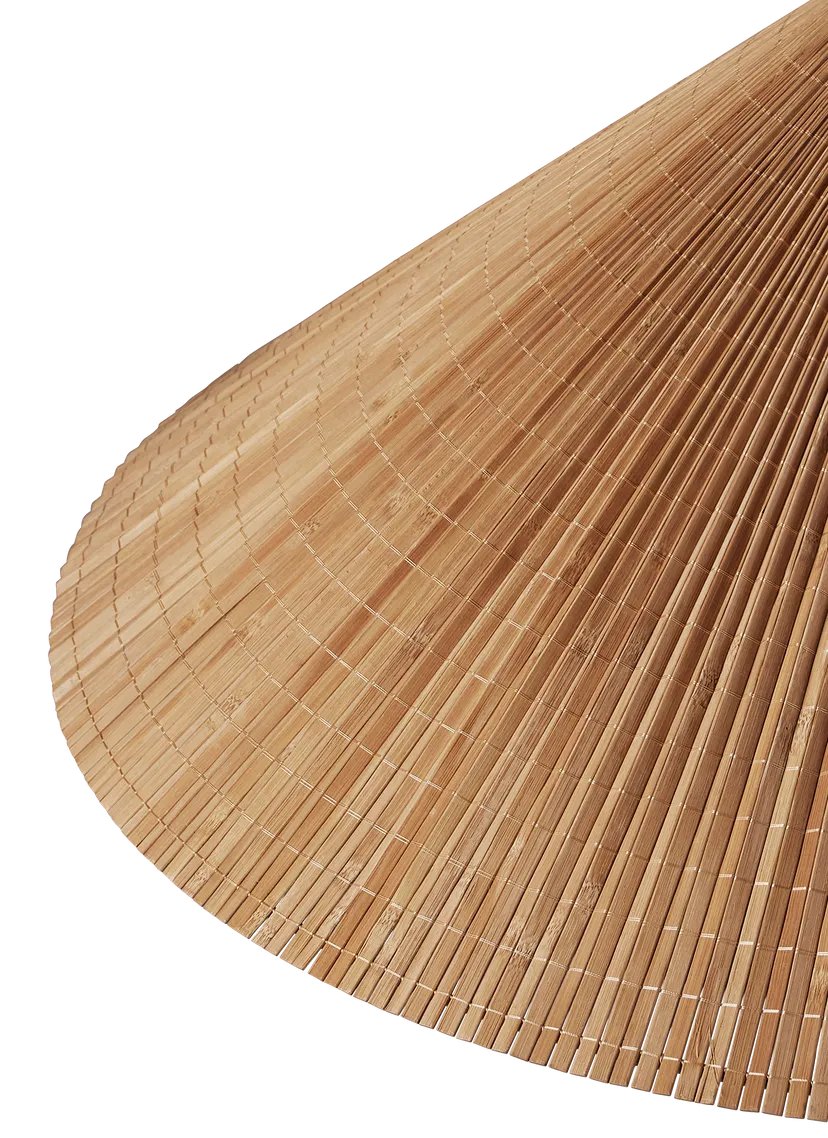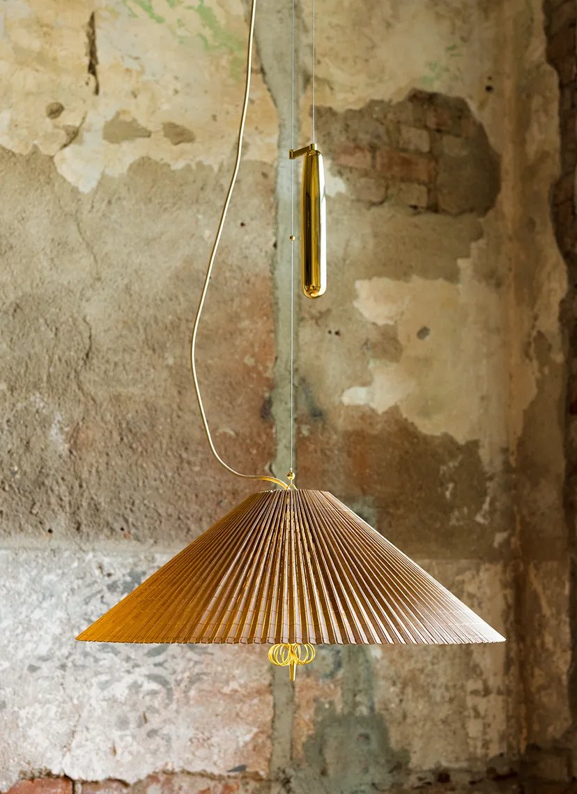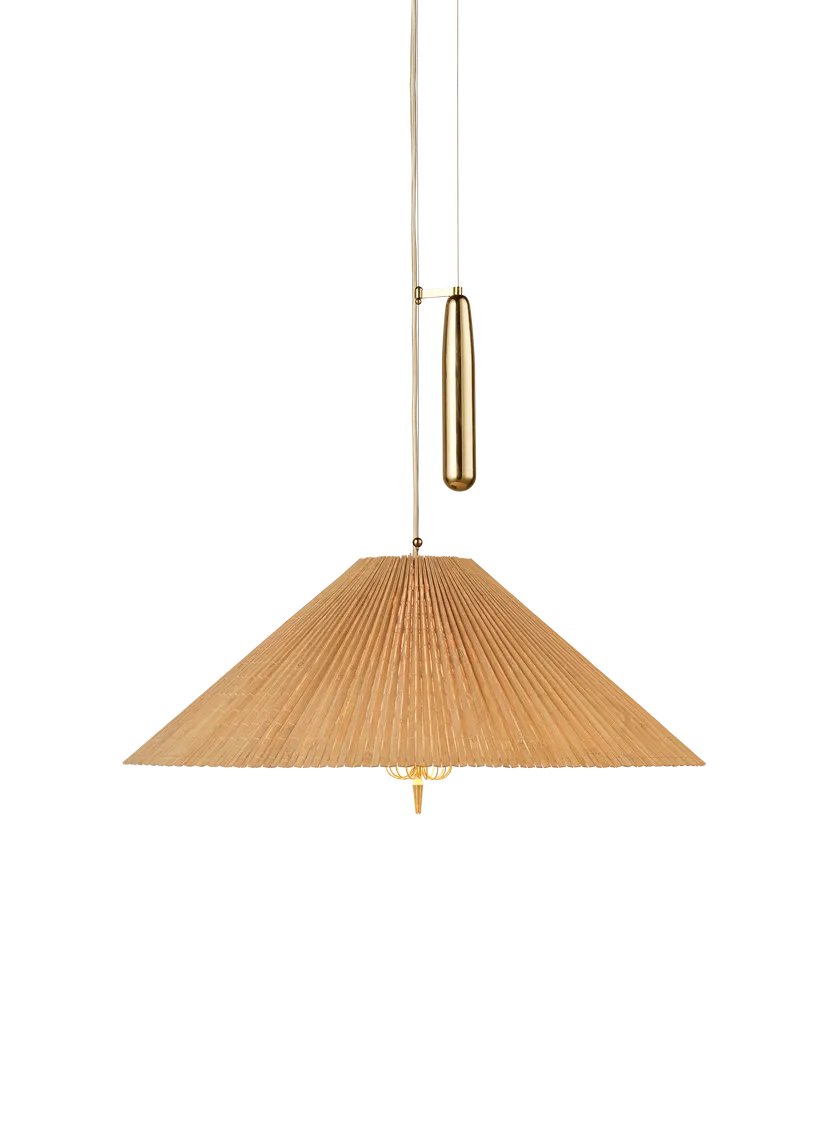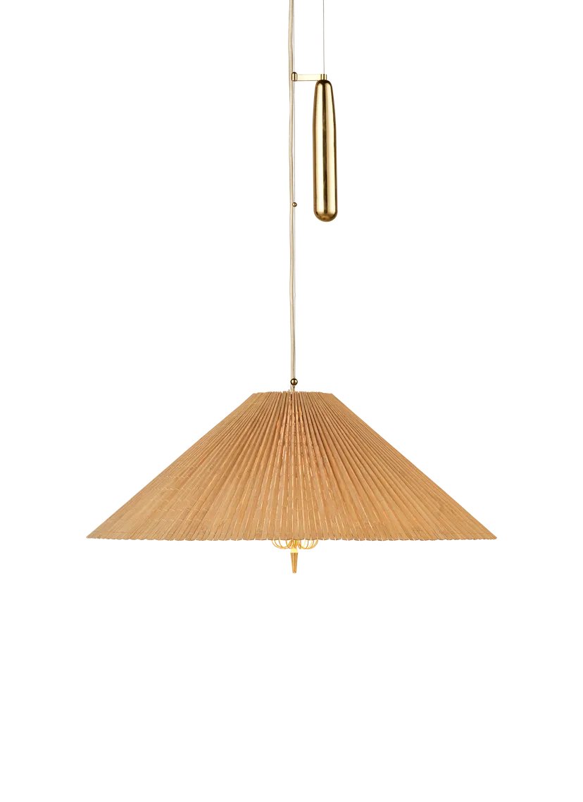 Designed by the legendary Paavo Tynell, the 1972 pendant features a conical shade in bamboo, crafted by master artisans. The the bamboo slats are hand sewn into a pleated mat and fastened by hand to the wire frame, with a linen liner in between. This directs light down towards the base and creates a diffuse glow around the shade and upward, as the bamboo slats are penetrated by the light. Tynell's signature brass details are present as well, adding an air of timelessness and perfectly complementing the warm tone of the wood and light. Below the bulb, a fabric diffuser modulates the light and, beneath this, a decorative brass detail gives each lamp a flourish of character, and subtly influences the play of light it generates.