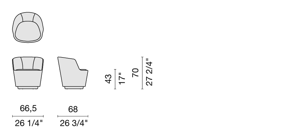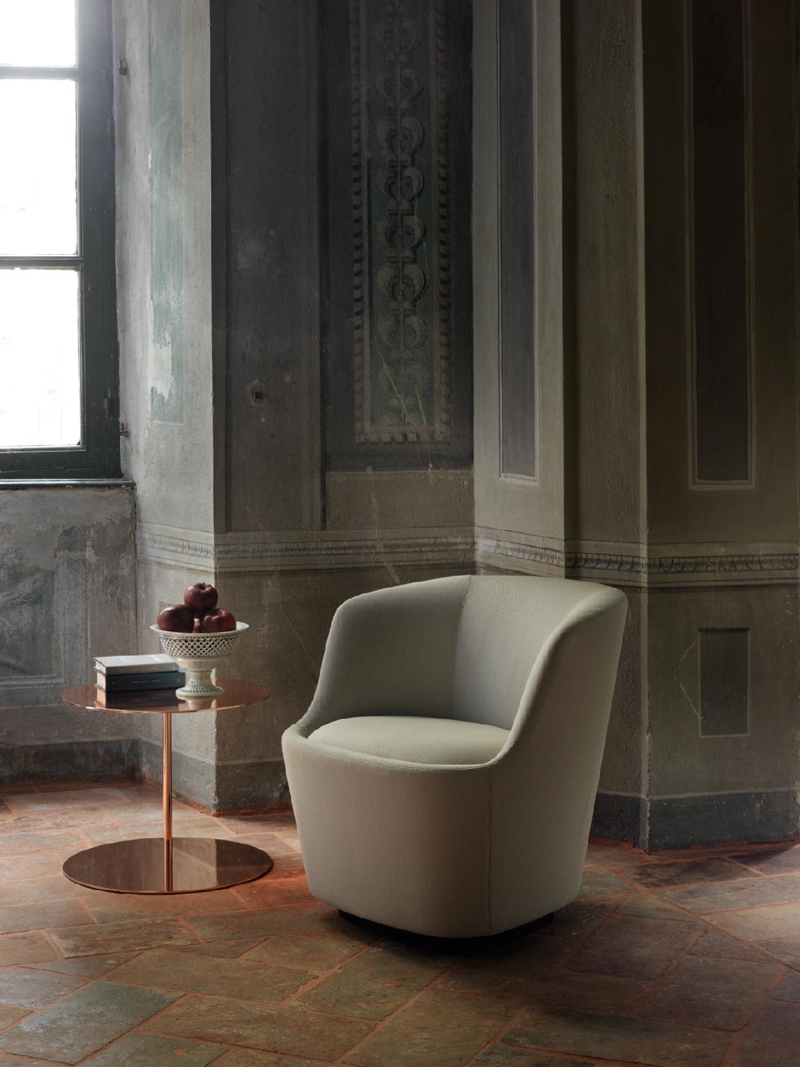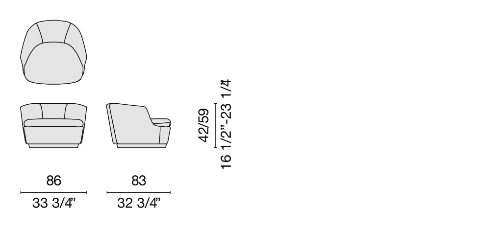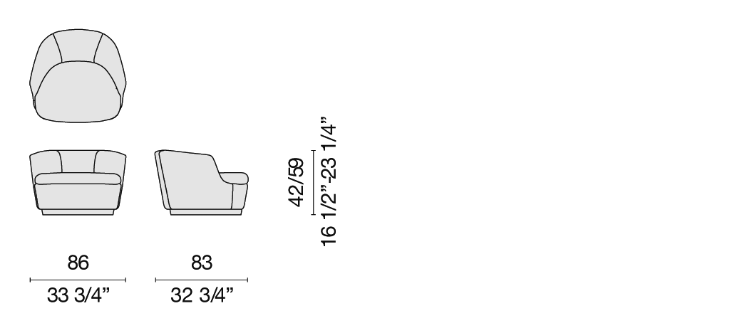 For the armchair and sofas, the cover of the structure is fixed, but removable for the cushions, and is available in the fabrics and leathers of the collection; for the small sofa and small armchair, the cover is fixed for both the structure and the cushions – all of which are also available in the fabrics and leathers in the collection.