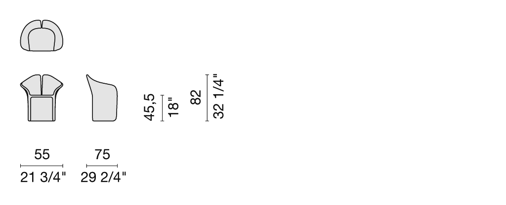 The colour palette of the small Frac armchair is characterized by sophisticated tones that were chosen to enhance the delicate curves, such as cloud, magnolia and mud.