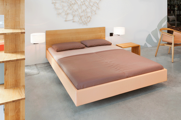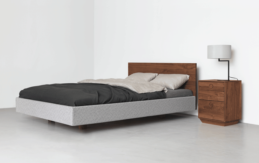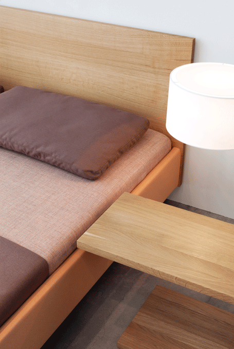 SIMPLE SOFT – the floating upholstered bed. The formal reduction of the SIMPLE collection was carried over to the upholstered bed. The fabric or leather-based design of the SIMPLE SOFT bed is available in three versions: a basic version without a headboard, a fully upholstered bed with an upholstered headboard and an upholstered bed frame with a wooden headboard. The cover is manufactured in one piece and can be easily removed for cleaning.