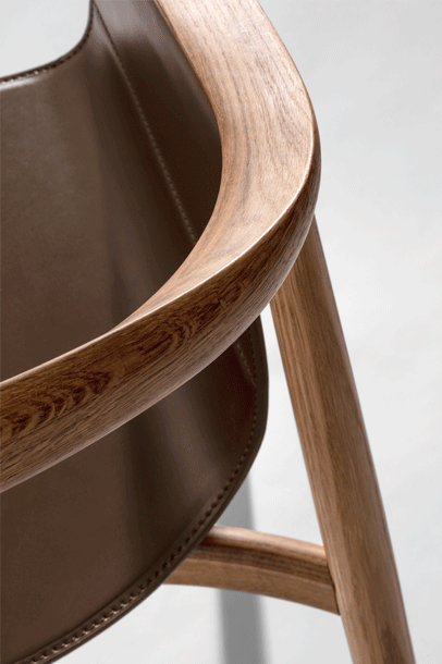 PELLE looks elegant and spacious, its semi-circular back and arm rest reflect the design language of Scandinavian classics. The special thing about PELLE is its freely hanging seat. It is held by a round strut that runs below the backrest. The roundwood holds the seat made of sleek leather.The incorporated aluminum insert forms the seat. In design terms, the merging back and arm rest is its standout feature. PELLE is suitable as a solitaire at the desk and in a group around the table.