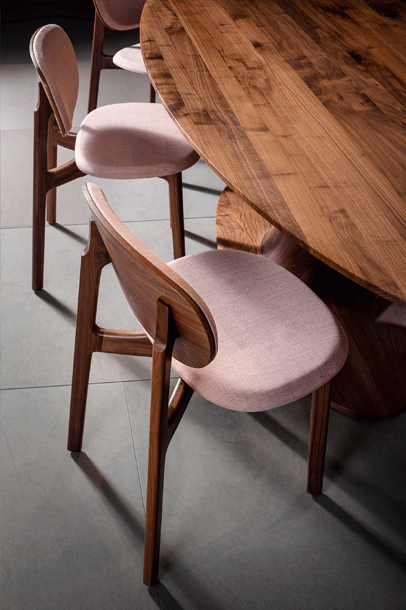 TURNTABLE OVAL – the oval table for large groups. This larger format was developed based on the round TURNTABLE, providing more seating and nevertheless saving space with a centre base. The table top, the centre base and the floor plate are oval. This form requires a very sophisticated level of craftsmanship and is unique as a solid wood version.