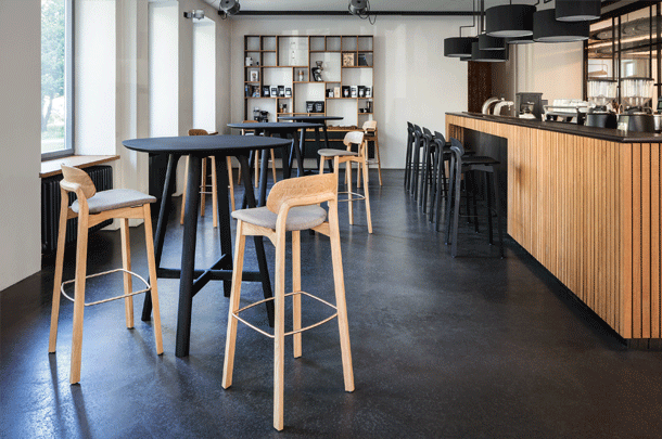 RAIL Café, Dine, Snack – communicative islands in space. In addition to the connectable RAIL system tables there are also individual table designs: The independent table-top formats of high tables, dining tables and café tables combine the advantages of rectangular and round tables, turning them into communication islands in the office landscape.