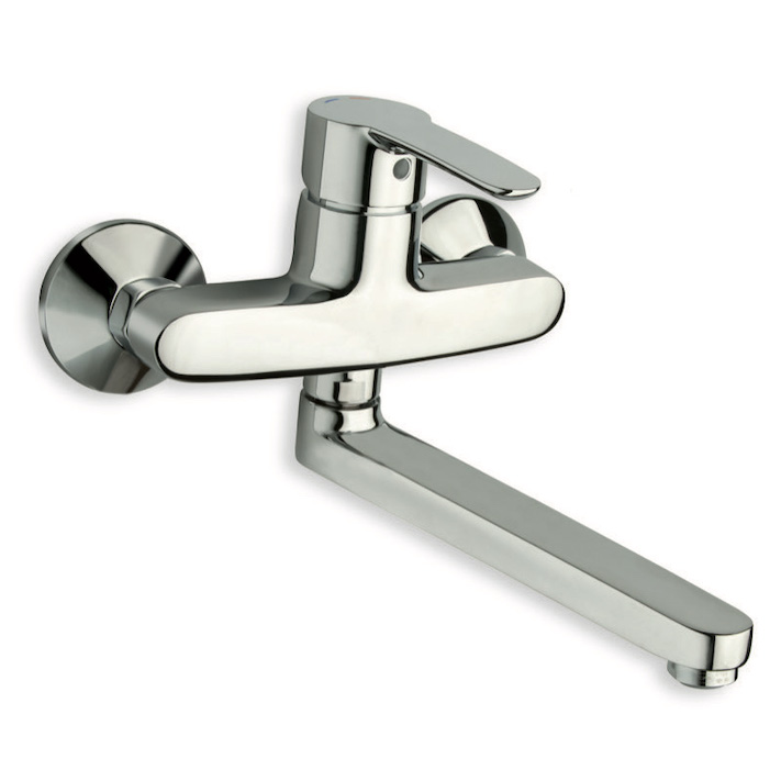 Miscelatore monocomando cucina, bocca orientabile, a parete, con miscelazione meccanica frontale. Punto di erogazione 239 mm