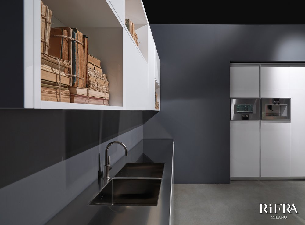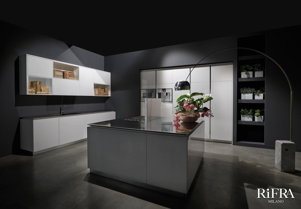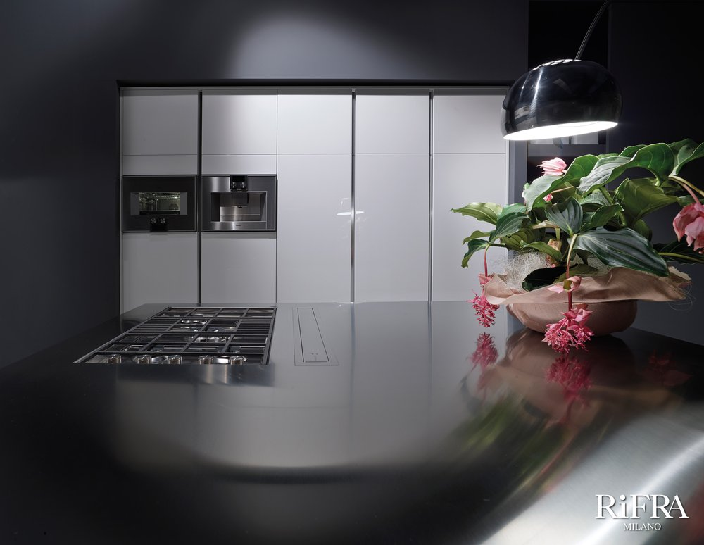 Finitura mobili isola e quinte: cemento nero spatolato a mano.