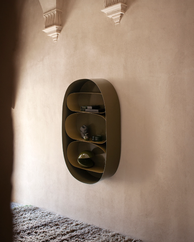 Astral is a metal cabinet forming part of Cosmic: Toogood’s collaborative collection with Tacchini. Like the other pieces in Cosmic, Astral celebrates irregular and elliptical shapes. Faye Toogood’s process is predominately rooted in hand-making maquettes out of everyday materials. The contours of Astral were first discovered in pliable aluminium mesh, then scaled up in steel. Like the Orbit tables or Lunar lights, the cabinet features soft shapes within shapes. Astral is designed with the playful and organic approach of the Toogood studio. Sculptural forms that unite the artistic with the everyday. The cabinet’s curves trick the eye and at first glance it appears Astral has no straight lines. The shelves are of course level and functional, ready for you to fill with your own curiosities.