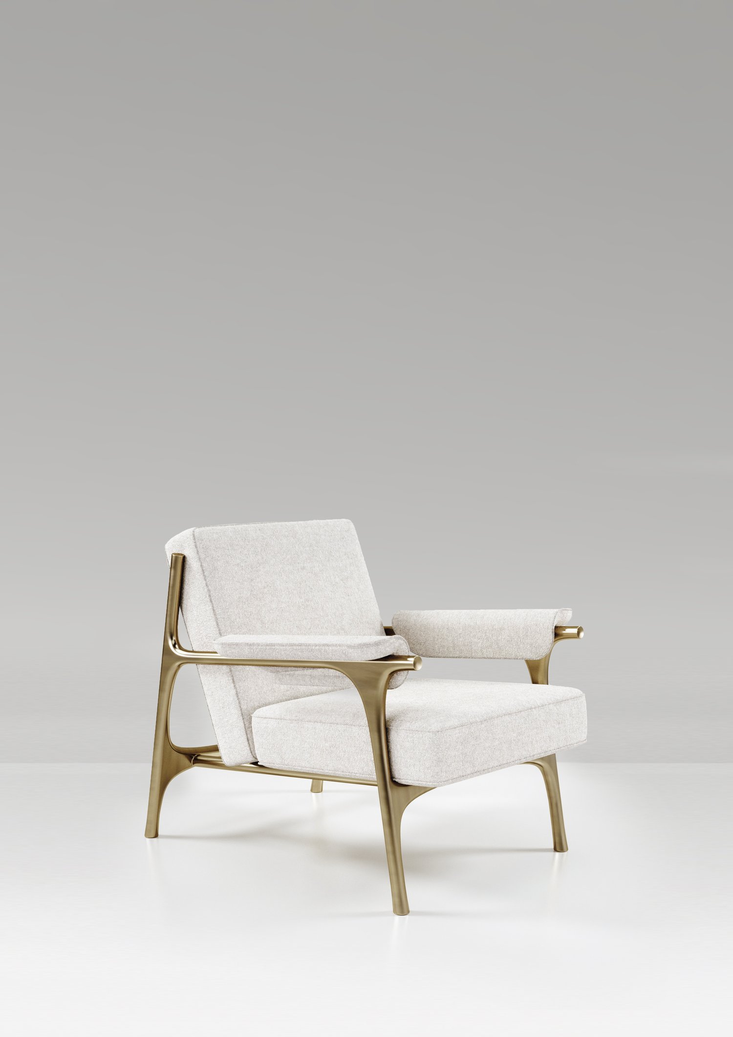 The Ramo armchair by R & Y Augousti is an elegant and versatile piece. The upholstered piece in Pierre Frey fabrics provide comfort while retaining a unique aesthetic with the bronze-patina brass frame and details. Part of the Ramo Seating Series.