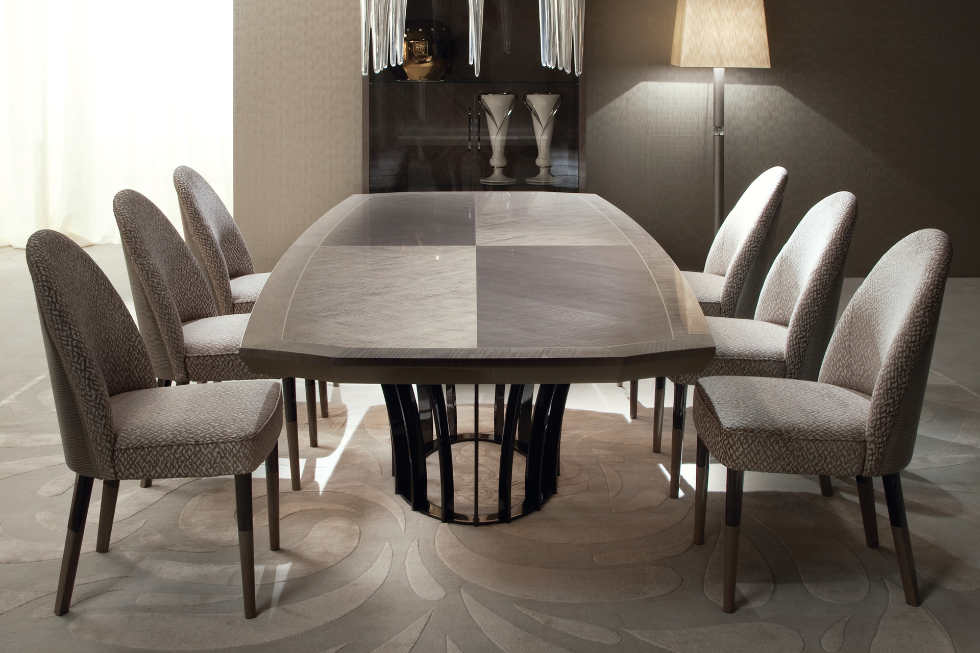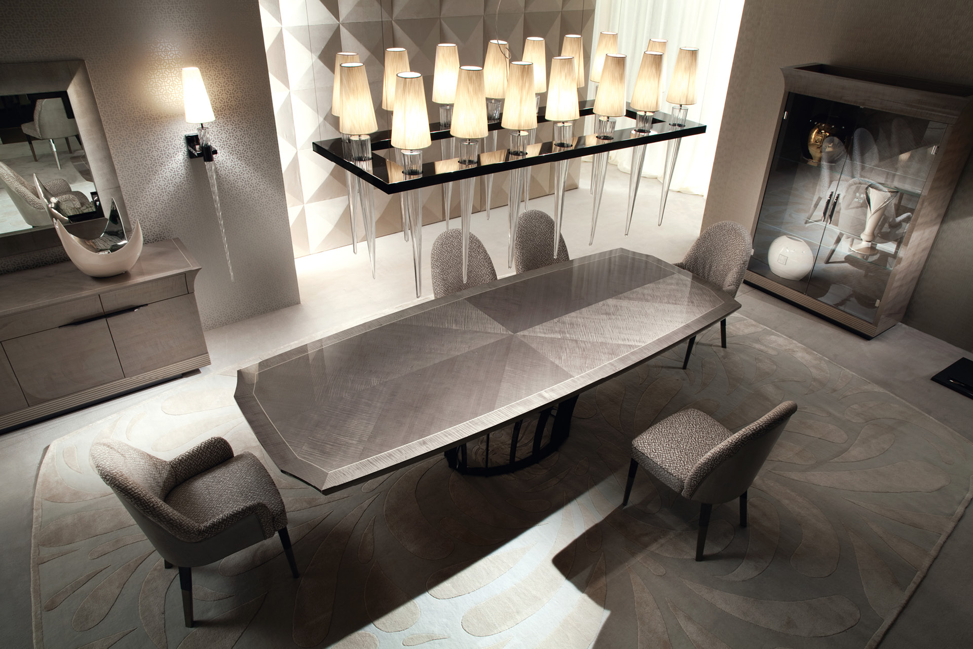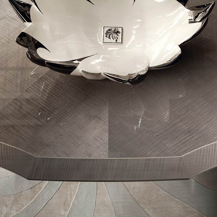 Boat shape oval table in tiger African sycomore veneer with high gloss polyester finish. Fixed top with base in stainless steel in storm dark grey finish. White maple fine line inlay in the top.