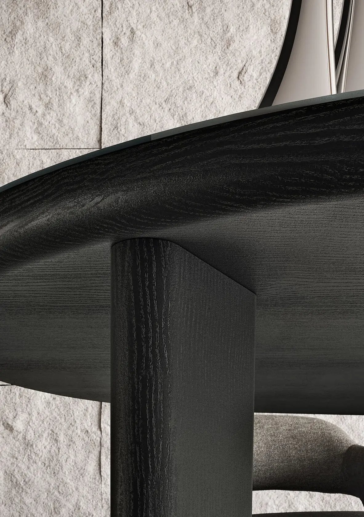 The design of the legs and their oblique placement lend an overall sense of dynamism. The density of the tabletop and of the legs adds solidity to the whole.