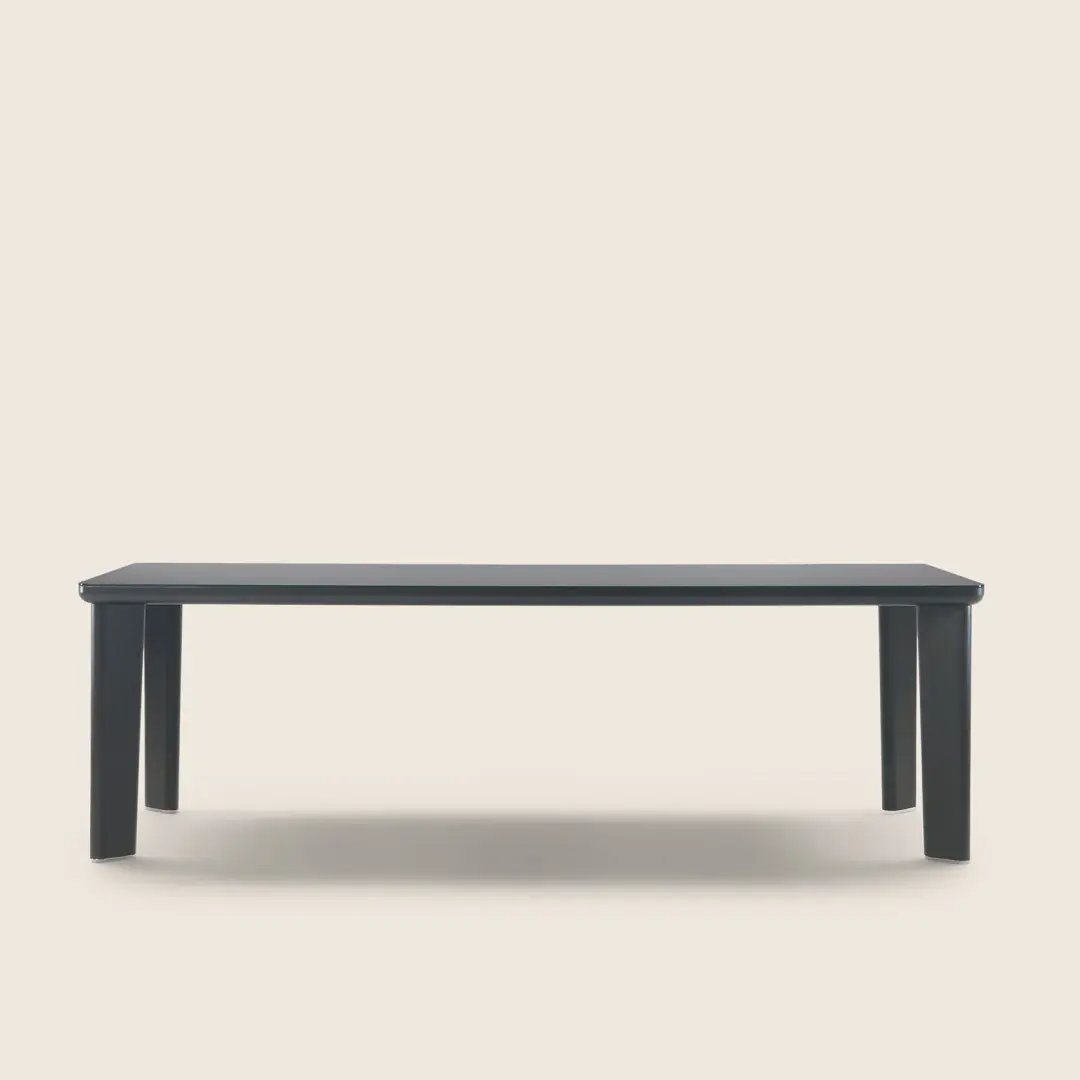 While the design is based on a single-material concept, in addition to veneered wood, the tabletop is also available in back-painted glass, in a palette of sophisticated colors.