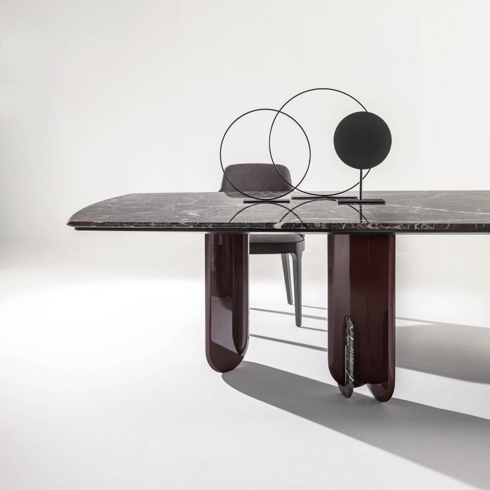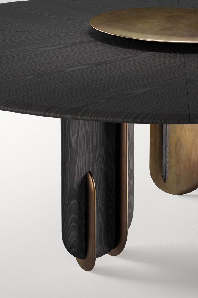 Table with rounded wooden top and modular legs with rounded section available in marble, natural, glossy lacquered and metallic lacquered wood. It is available in the round, rectangular or square version, and can be equipped with a Lazy Susan accessory.