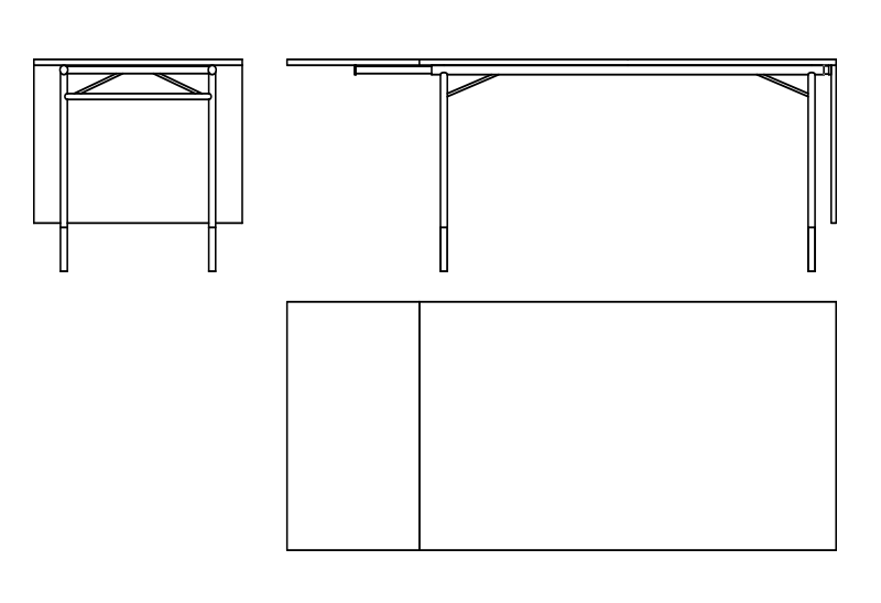 Materials: Teak, oak, walnut, Oregon pine veneer or linoleum in the colours 'black' or 'mushroom' with matching wooden toes. Tabletop in veneer or linoleum with solid edges. Painted frame in black, orange or light blue.